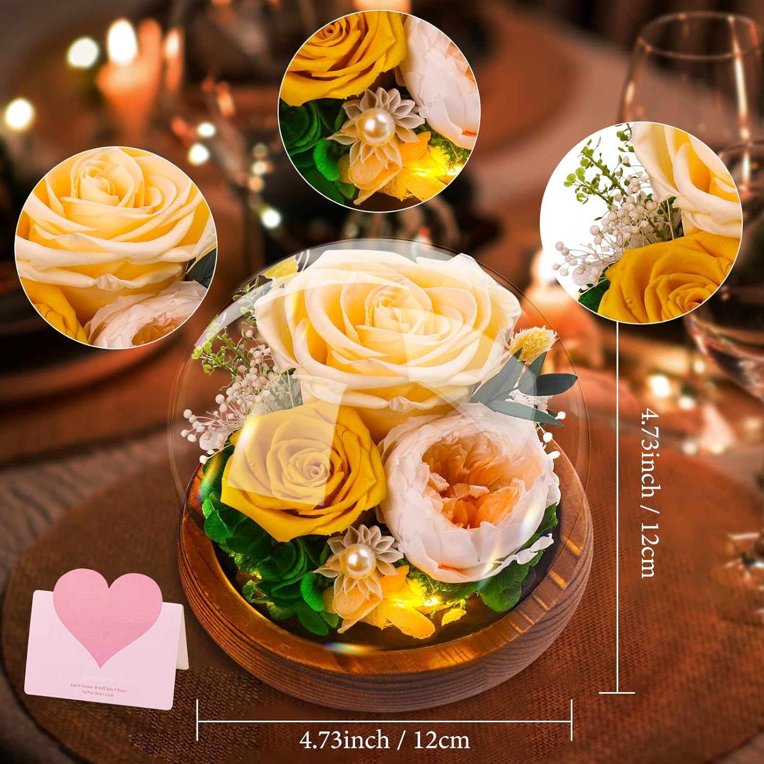 Препоръчваме внимателно боравене с продукта и избягване на отваряне на стъкления купол, за да се избегне случайно повреждане на цветята.