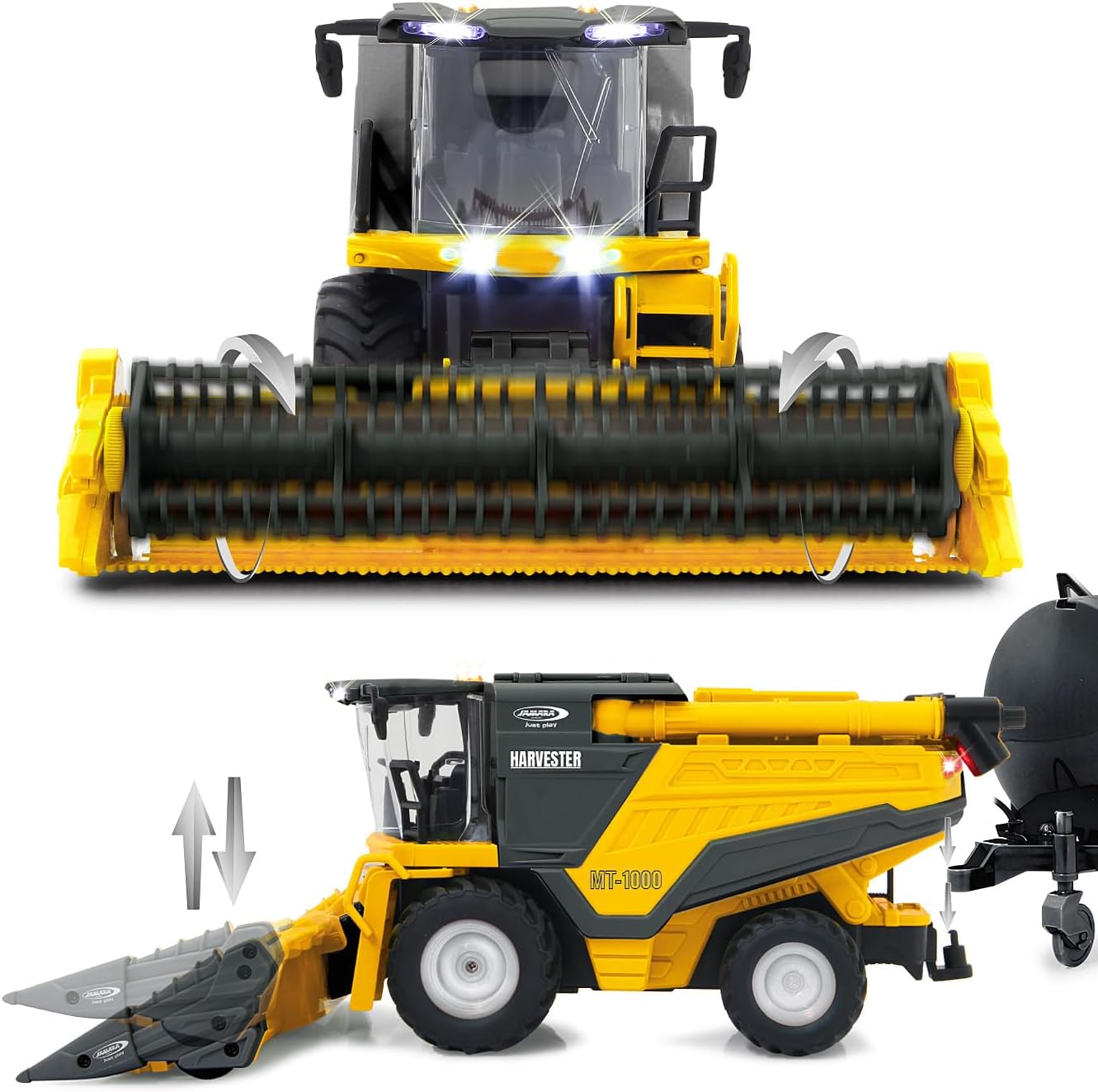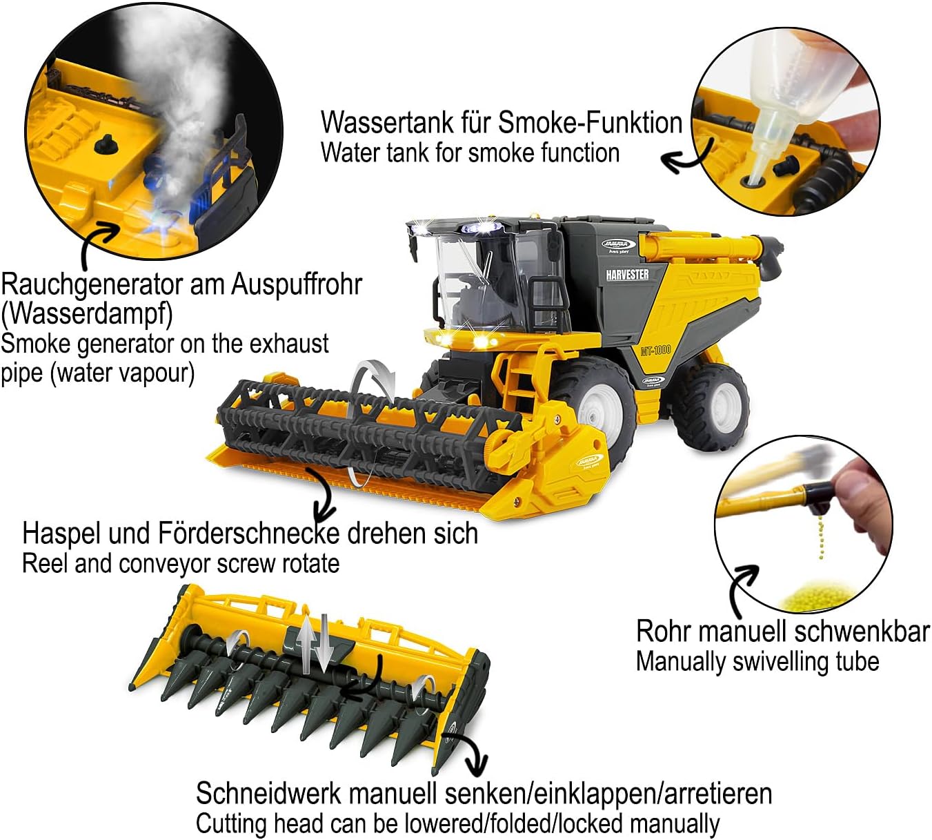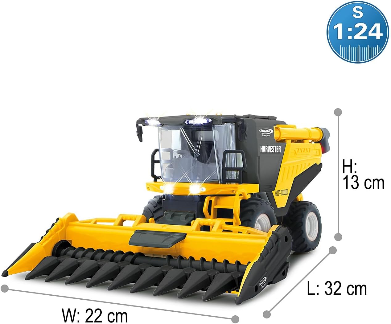 Whether wheat, rye, barley, oats, rapeseed, corn or sunflowers. Large combine harvesters are always used when harvesting these plants. The remote controlled combine harvester MT-1000 from JAMARA is a first-class agricultural machine and will delight kids from 6 years. This detailed replica multifunctional vehicle in scale 1:24 impresses with its versatility and extensive functions. With one hand the MT-1000 can be converted from a combine harvester to a corn chopper. Simply change the reel cutter by hand for the corn picker harvesting attachment and the machine is ready for a new area of application. The rounded edges and robust construction of the MT-1000 ensure safe and carefree play. The rotating mower simulates the cutting of grain stalks clearly and makes agriculture playfully experienced for children. The model is equipped with integrated LED lights in orange and white that light up while driving and flash in reverse. A special highlight is the small tank next to the exhaust, which can be filled with real water to simulate realistic smoke vapors. At the touch of a button on the remote control, steam then rises, which visually simulates the smoke flues of the exhaust gases. The enclosed play grain can be filled into the hinged grain tank and turned out by hand via the 360 degree swivel unloading auger. So the combine harvester from JAMARA offers long-lasting fun and an authentic gaming experience. Highlights: · 2.4 GHz for multiplayer operation · Reversing warning sound · Auto standby mode · Profiled rubber tyres · LED light front/rear · LED signal lights · Water tank for smoke function · Smoke generator on the exhaust pipe (water vapour) · Towing hitch functions: · Forward/reverse · Left/Right · Stop · More realistic. Motor sound, disoff Bar · LED light on/off · Manual lower/fold/lock cutting unit · Removable cutting unit · Manual pivoting overloading tube · Overloading tube with manually operated discharge auger · Reel and screw conveyor rotate when driving with lowered cutting mechanism · Ascent stairs to the cabin can be manually rotated · Open / close grain tank flaps manually The ladder back back in the back · Smoke generator on/off product details: · Driving time approx. (min. ): 20 · Colour: yellow · Maximum speed approx. (km/h): 1 · Charging time USB approx. (Hours. ): 2. Charging time USB approx. (min): 120 · Scale: 1:24S Box contents: · Model · Remote control 2.4GHz · Driving battery · USB charger · Filling bottle · Game grain · Second cutting unit · Instructions Notes: · Required accessories: 2 x AAA cells // LR03 (alkaline) // HR03 (NiMH) · Age. recommendation: ab 6-year safety instructions: · Attention – Use under the direct supervision of an adult. Warning: not suitable for children under 36 months. Contains small parts. Choking hazard! Keep away from toddlers. · Lithium battery included. Please note the instruction manual (English language not guaranteed)