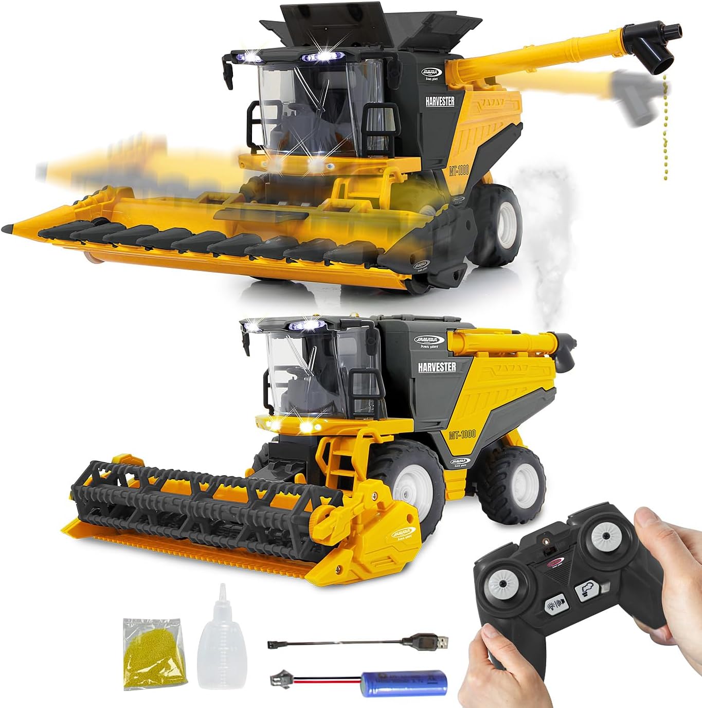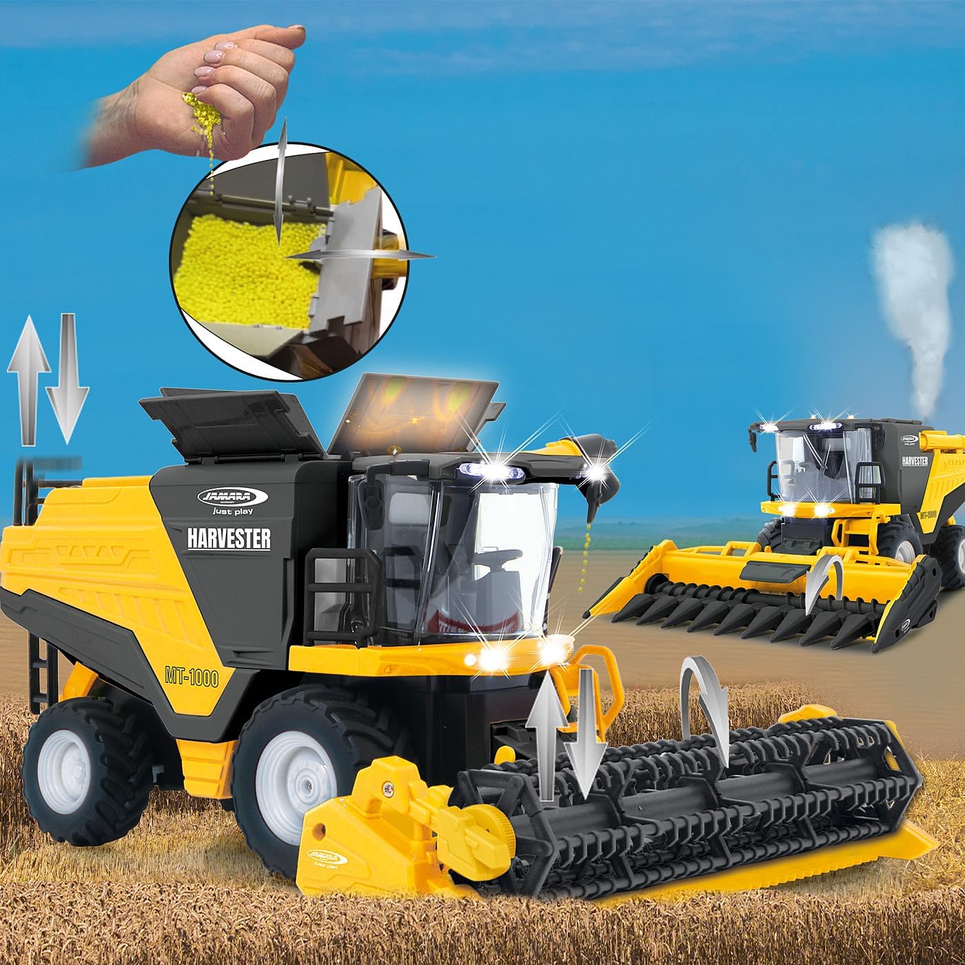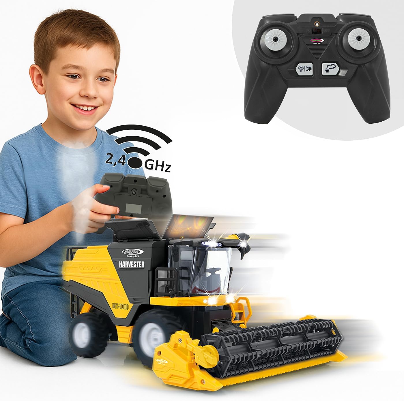 Whether wheat, rye, barley, oats, rapeseed, corn or sunflowers. Large combine harvesters are always used when harvesting these plants. The remote controlled combine harvester MT-1000 from JAMARA is a first-class agricultural machine and will delight kids from 6 years. This detailed replica multifunctional vehicle in scale 1:24 impresses with its versatility and extensive functions. With one hand the MT-1000 can be converted from a combine harvester to a corn chopper. Simply change the reel cutter by hand for the corn picker harvesting attachment and the machine is ready for a new area of application. The rounded edges and robust construction of the MT-1000 ensure safe and carefree play. The rotating mower simulates the cutting of grain stalks clearly and makes agriculture playfully experienced for children. The model is equipped with integrated LED lights in orange and white that light up while driving and flash in reverse. A special highlight is the small tank next to the exhaust, which can be filled with real water to simulate realistic smoke vapors. At the touch of a button on the remote control, steam then rises, which visually simulates the smoke flues of the exhaust gases. The enclosed play grain can be filled into the hinged grain tank and turned out by hand via the 360 degree swivel unloading auger. So the combine harvester from JAMARA offers long-lasting fun and an authentic gaming experience. Highlights: · 2.4 GHz for multiplayer operation · Reversing warning sound · Auto standby mode · Profiled rubber tyres · LED light front/rear · LED signal lights · Water tank for smoke function · Smoke generator on the exhaust pipe (water vapour) · Towing hitch functions: · Forward/reverse · Left/Right · Stop · More realistic. Motor sound, disoff Bar · LED light on/off · Manual lower/fold/lock cutting unit · Removable cutting unit · Manual pivoting overloading tube · Overloading tube with manually operated discharge auger · Reel and screw conveyor rotate when driving with lowered cutting mechanism · Ascent stairs to the cabin can be manually rotated · Open / close grain tank flaps manually The ladder back back in the back · Smoke generator on/off product details: · Driving time approx. (min. ): 20 · Colour: yellow · Maximum speed approx. (km/h): 1 · Charging time USB approx. (Hours. ): 2. Charging time USB approx. (min): 120 · Scale: 1:24S Box contents: · Model · Remote control 2.4GHz · Driving battery · USB charger · Filling bottle · Game grain · Second cutting unit · Instructions Notes: · Required accessories: 2 x AAA cells // LR03 (alkaline) // HR03 (NiMH) · Age. recommendation: ab 6-year safety instructions: · Attention – Use under the direct supervision of an adult. Warning: not suitable for children under 36 months. Contains small parts. Choking hazard! Keep away from toddlers. · Lithium battery included. Please note the instruction manual (English language not guaranteed)