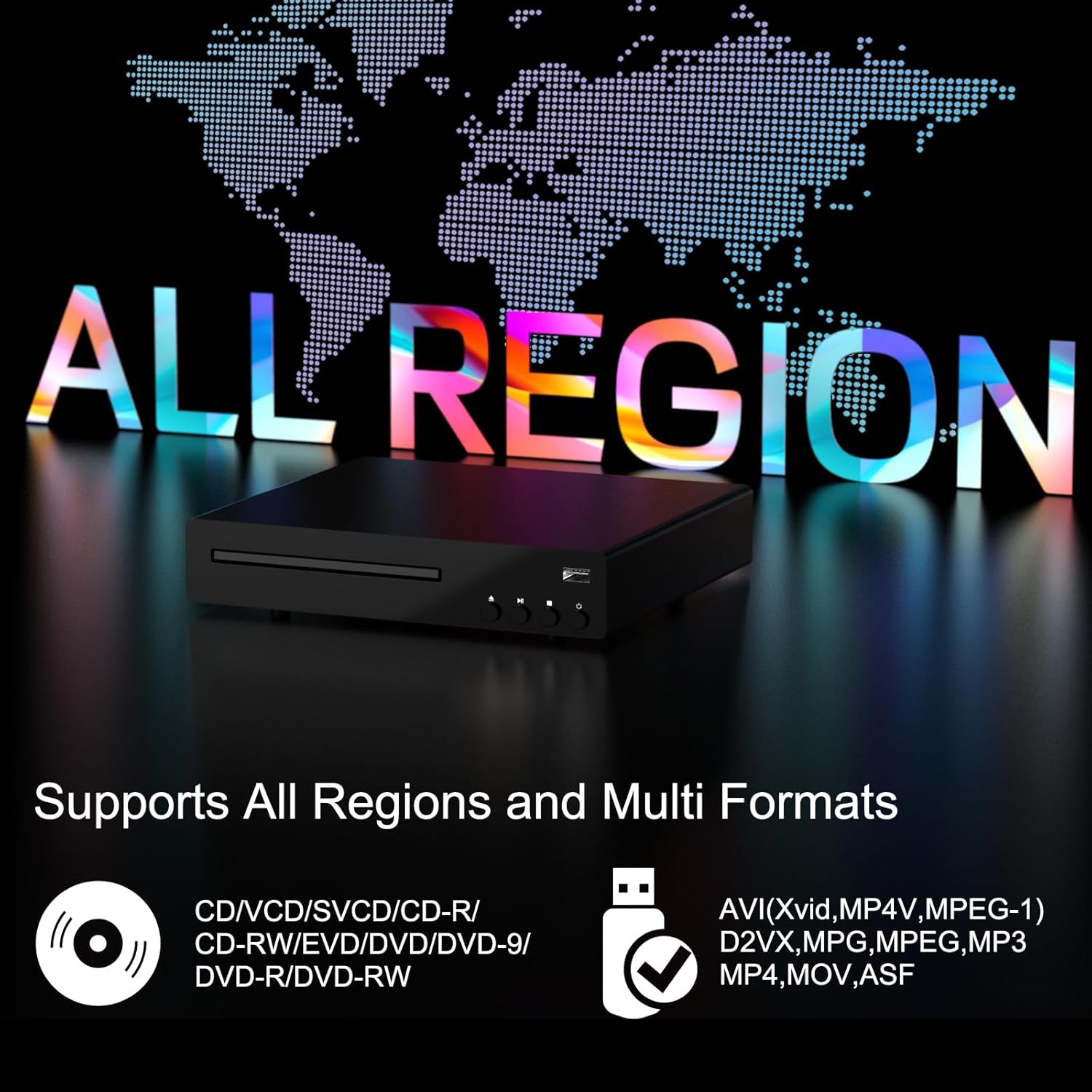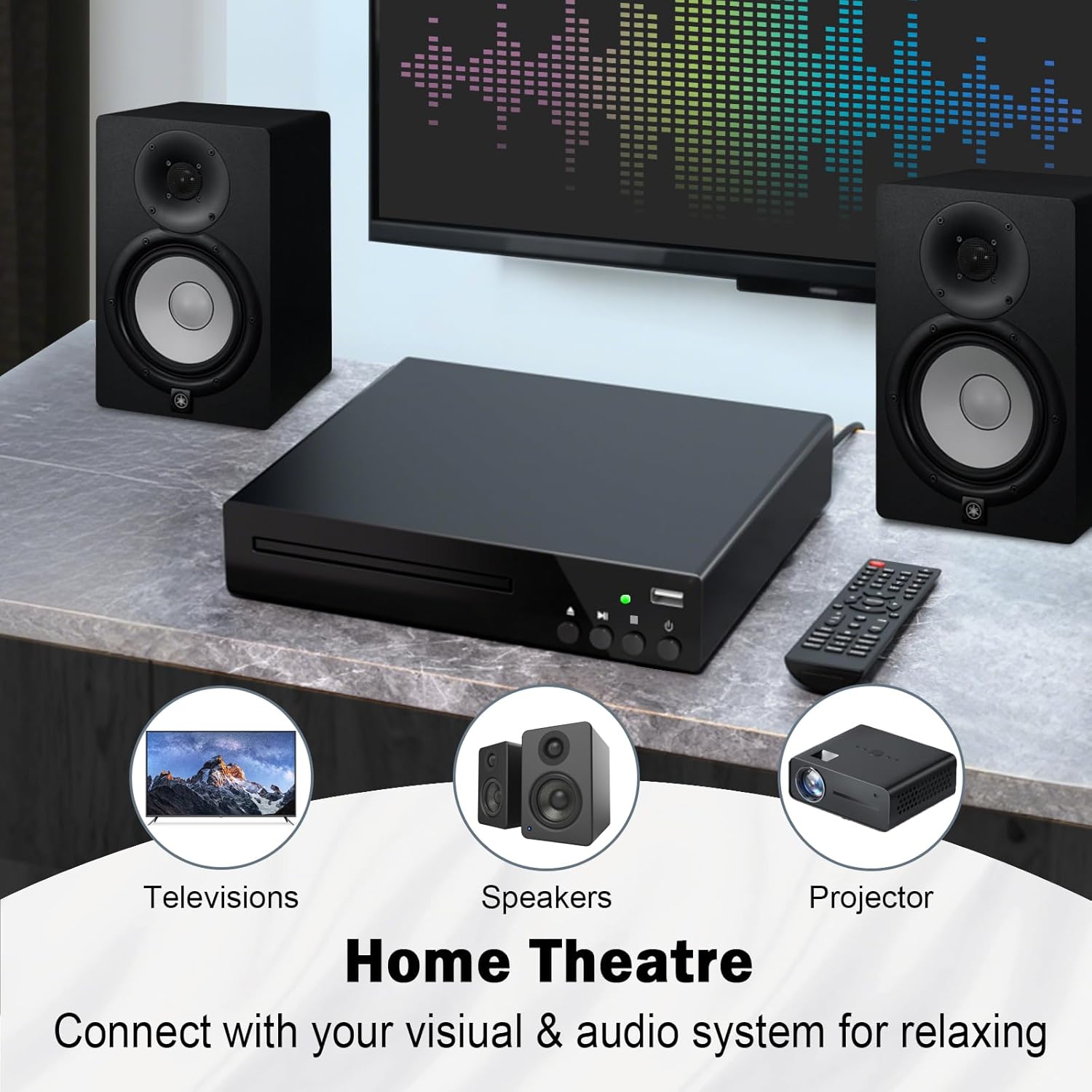• Създайте своето домашно кино: Персонализирайте домашното си кино с нашия DVD плейър с висока резолюция, който поддържа HD 1080P и Dolby Digital Audio. Просто го свържете към вашата стереоуредба с включените HDMI и RCA кабели, за да създадете кинематографично съраунд звук. Свържете го към смарт телевизори, проектори, компютри и други, за да изберете предпочитания от вас аудио и видео изход.