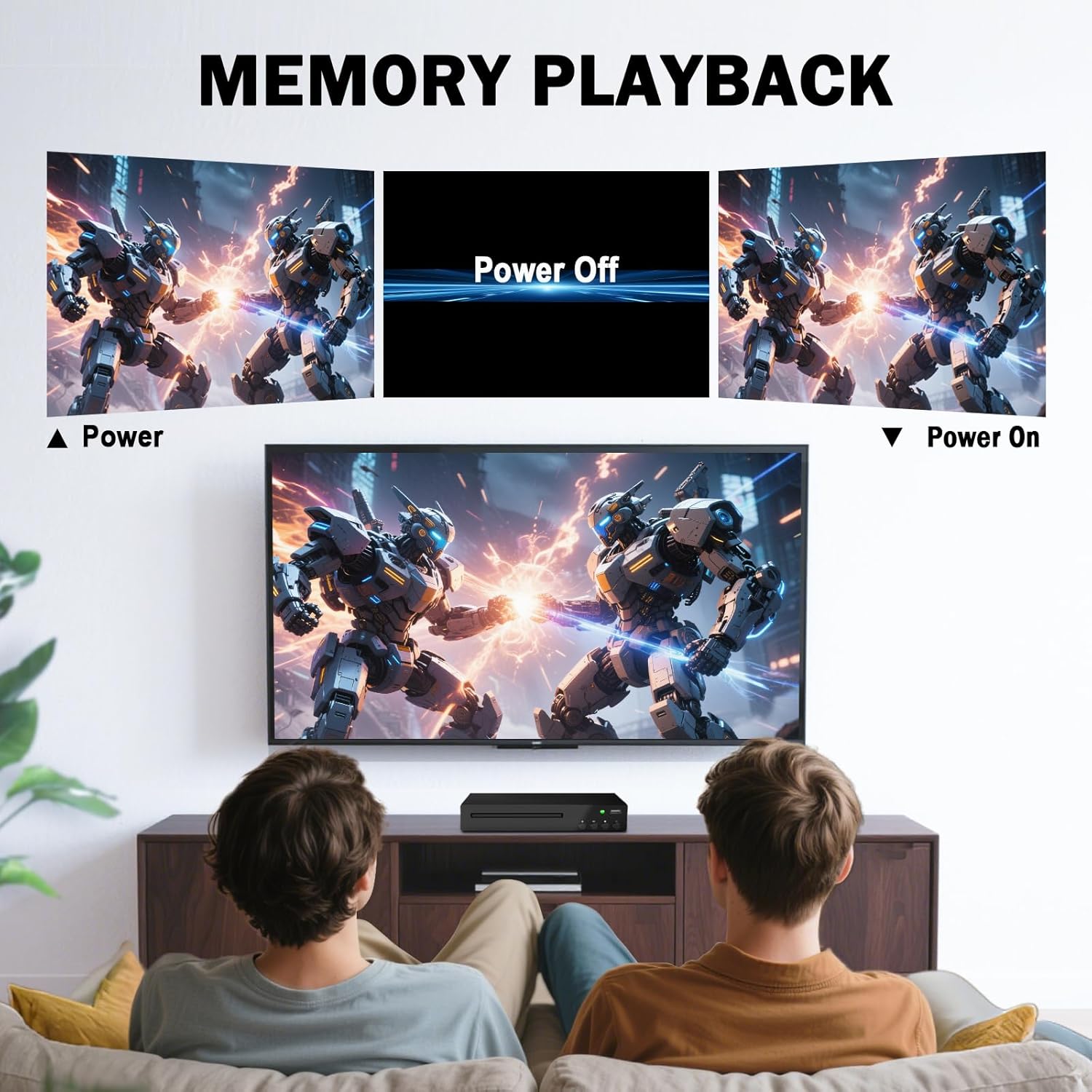 • Потопете се в неограничено забавление: Потопете се в свят на неограничено забавление с нашия свръхмодерен DVD плейър, безплатен за всички региони. Оборудван с мощно ядро, HD DVD плейърът без усилие чете различни DVD/CD формати, като DVD, DVD-R/+R, DVD-/RW, CD, CD-R/RW, VCD, SVCD и ви позволява безпроблемно да излъчвате разнообразни филми и телевизионни епизоди от всички краища на света.
