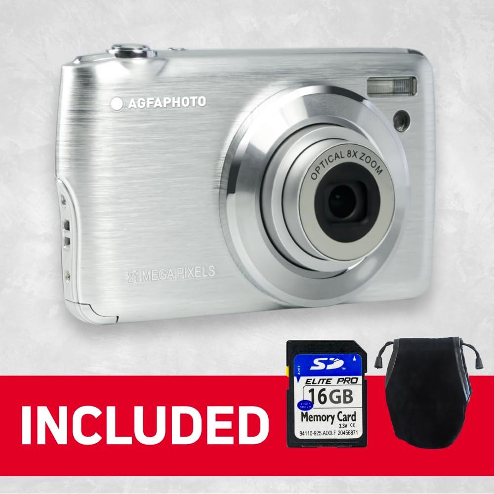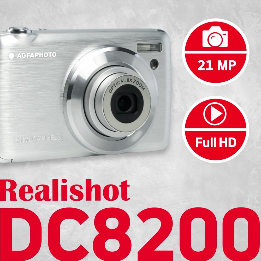 Компактен фотоапарат AGFA PHOTO Realishot DC8200, 18MP, Full HD видео, 2.7-инчов LCD екран, 8x оптично увеличение, литиева батерия и 16GB SD карта - сребрист