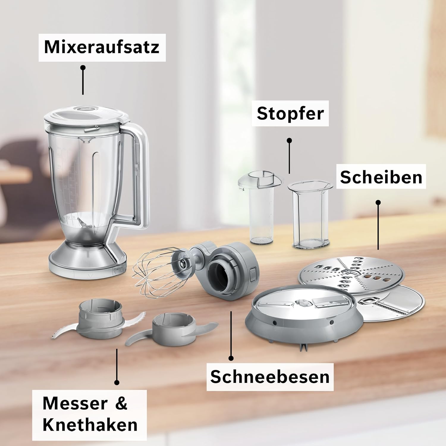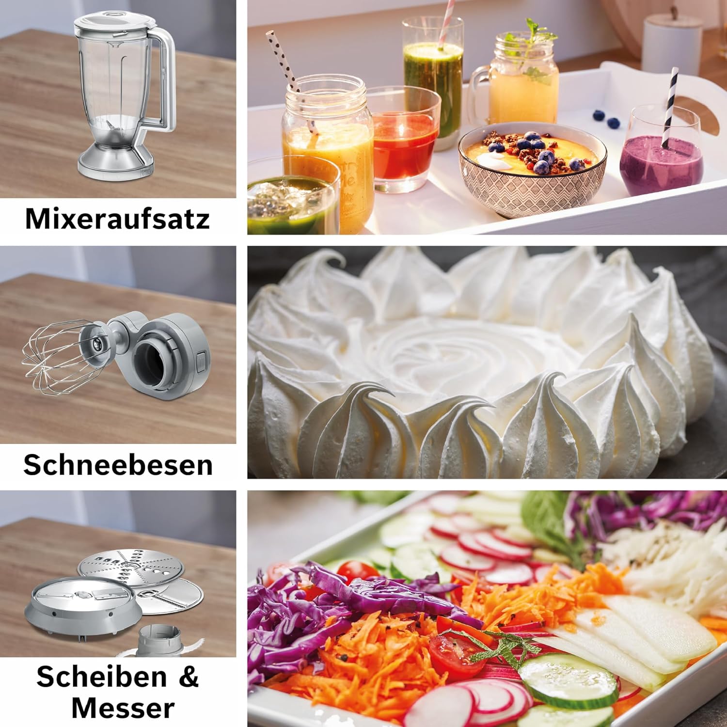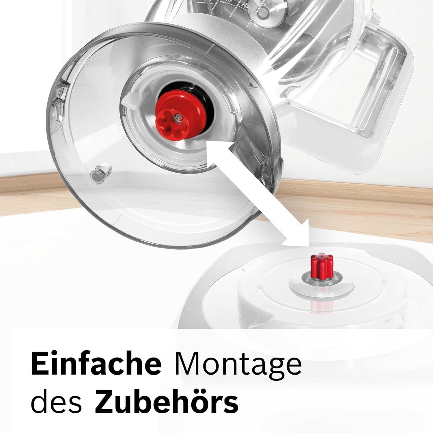 • XXL купа за смесване с обем 3,9 л за до 1,5 кг тесто и приставка за блендер, изработена от висококачествен тритан с обем 1,5 л.