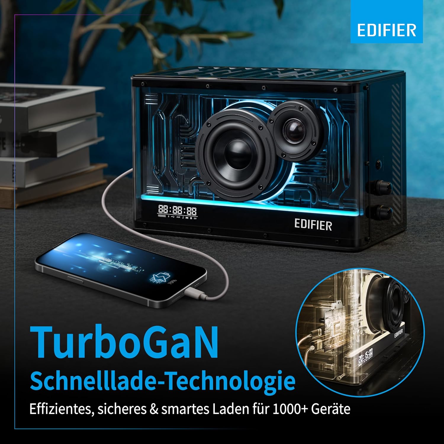 Neben dem optischen Highlight bietet das Bluetooth-Lautsprecher-System auch eine integrierte Schnellladefunktion mit der TurboGaN-Technologie. Diese erlaubt ein effizientes und sicheres Aufladen verschiedenster Geräte, darunter Smartphones, Tablets oder kabellose Kopfhörer über USB-C 35W & USB-A 18W. Mit hoher Ladegeschwindigkeit und optimierter Energieeffizienz wird der Ladevorgang beschleunigt, ohne die Akkulebensdauer der angeschlossenen Geräte zu beeinträchtigen. Die Technologie unterstützt eine breite Kompatibilität mit über 1000 Geräten, sodass du stets eine zuverlässige Stromquelle griffbereit hast.