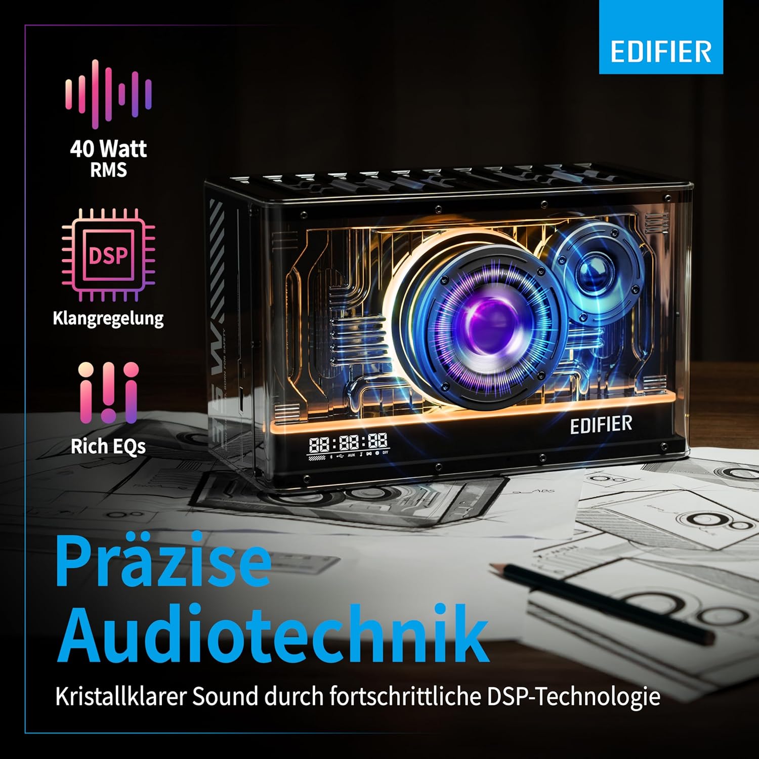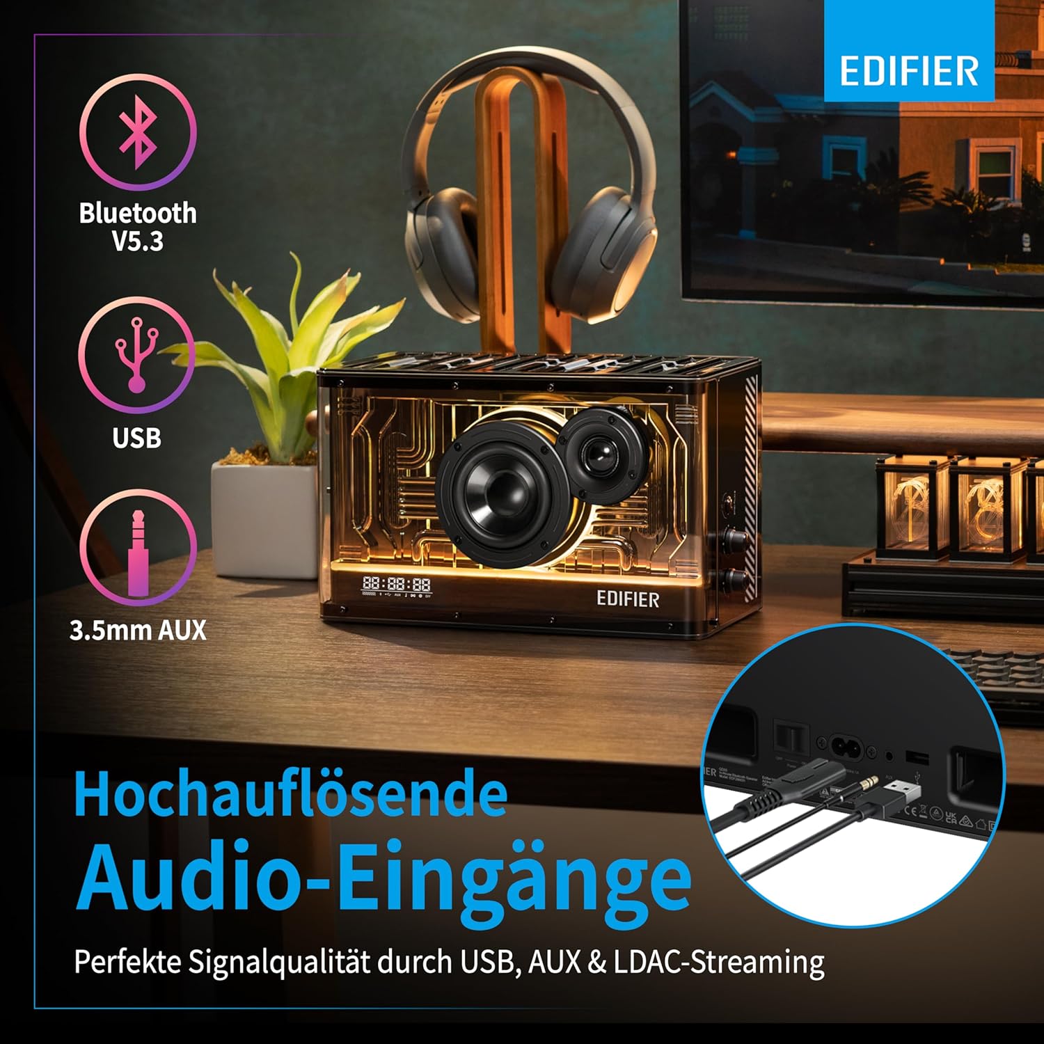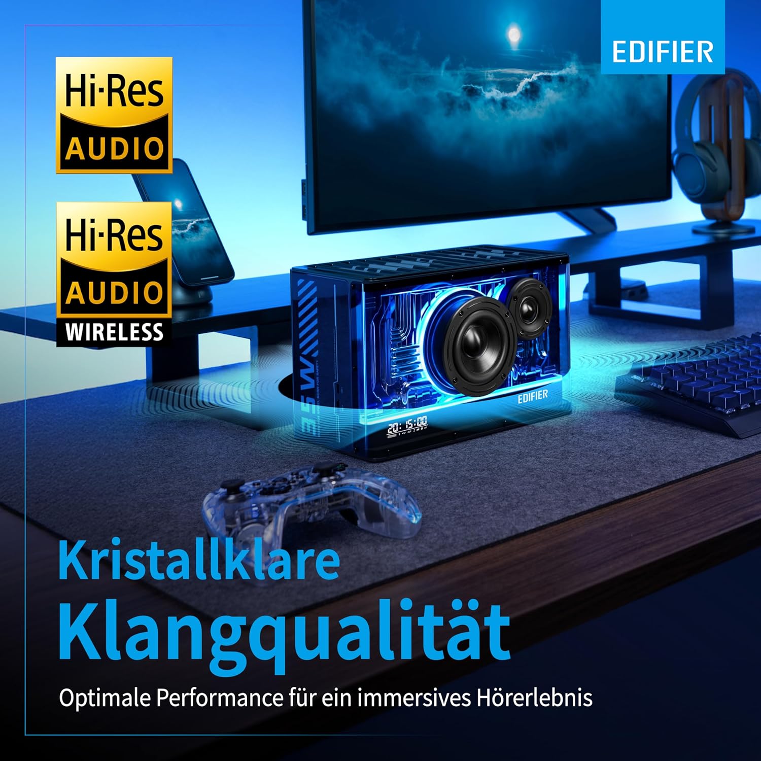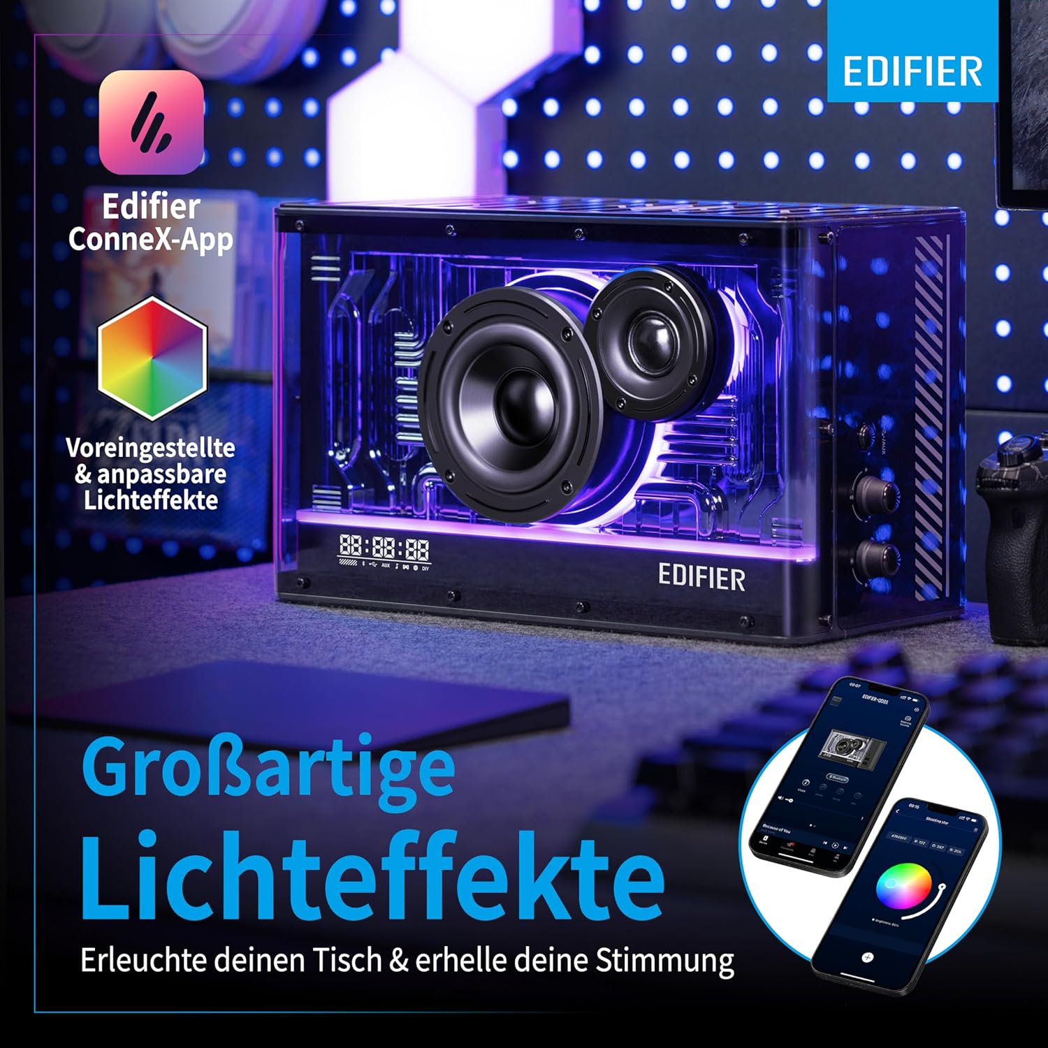 | RGB-Beleuchtung: | Individuelle RGB-Beleuchtung mit voreingestellten und anpassbaren Effekten. Steuerung über die Edifier ConneX-App für einfache Anpassung von Klang und Lichteffekten. |