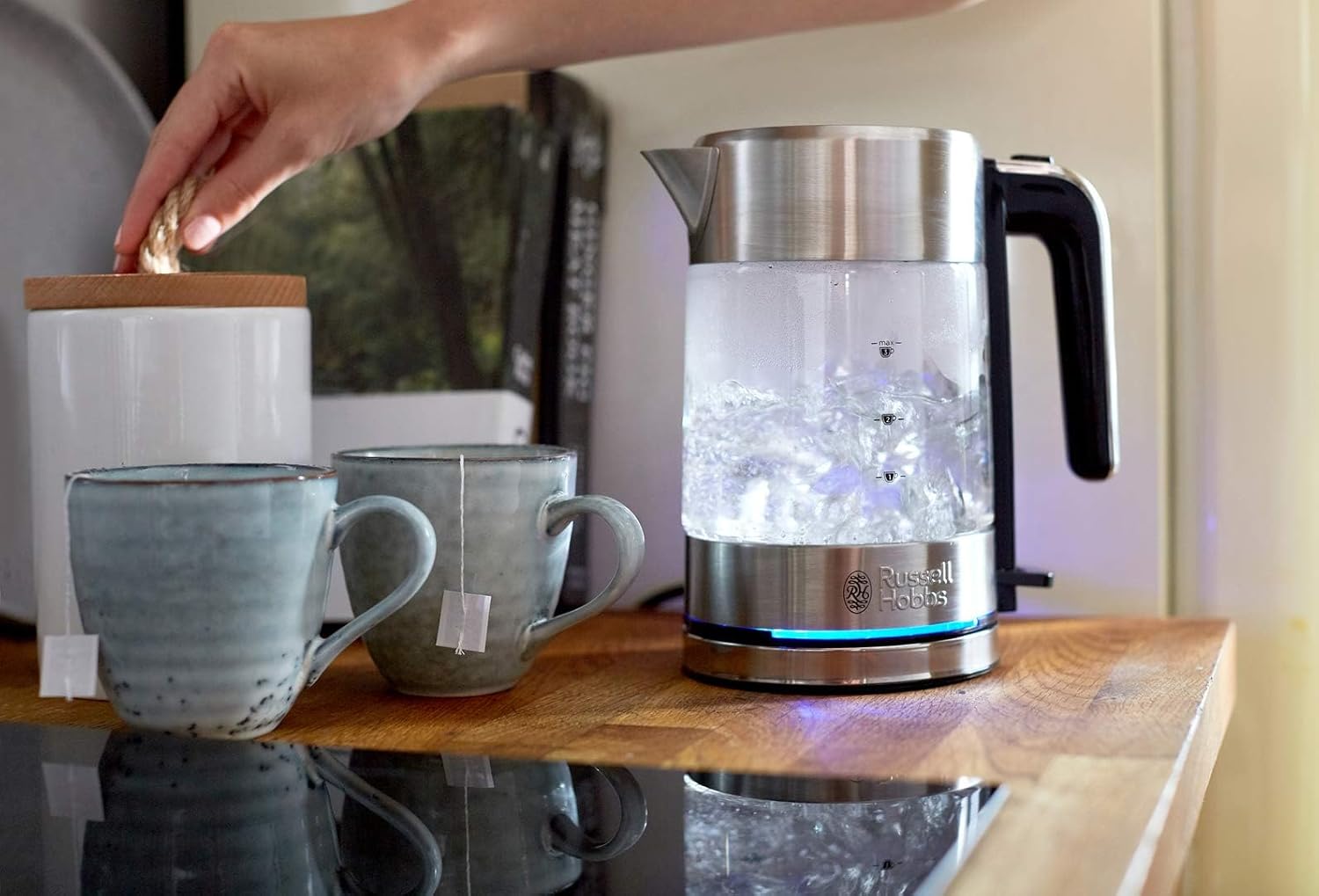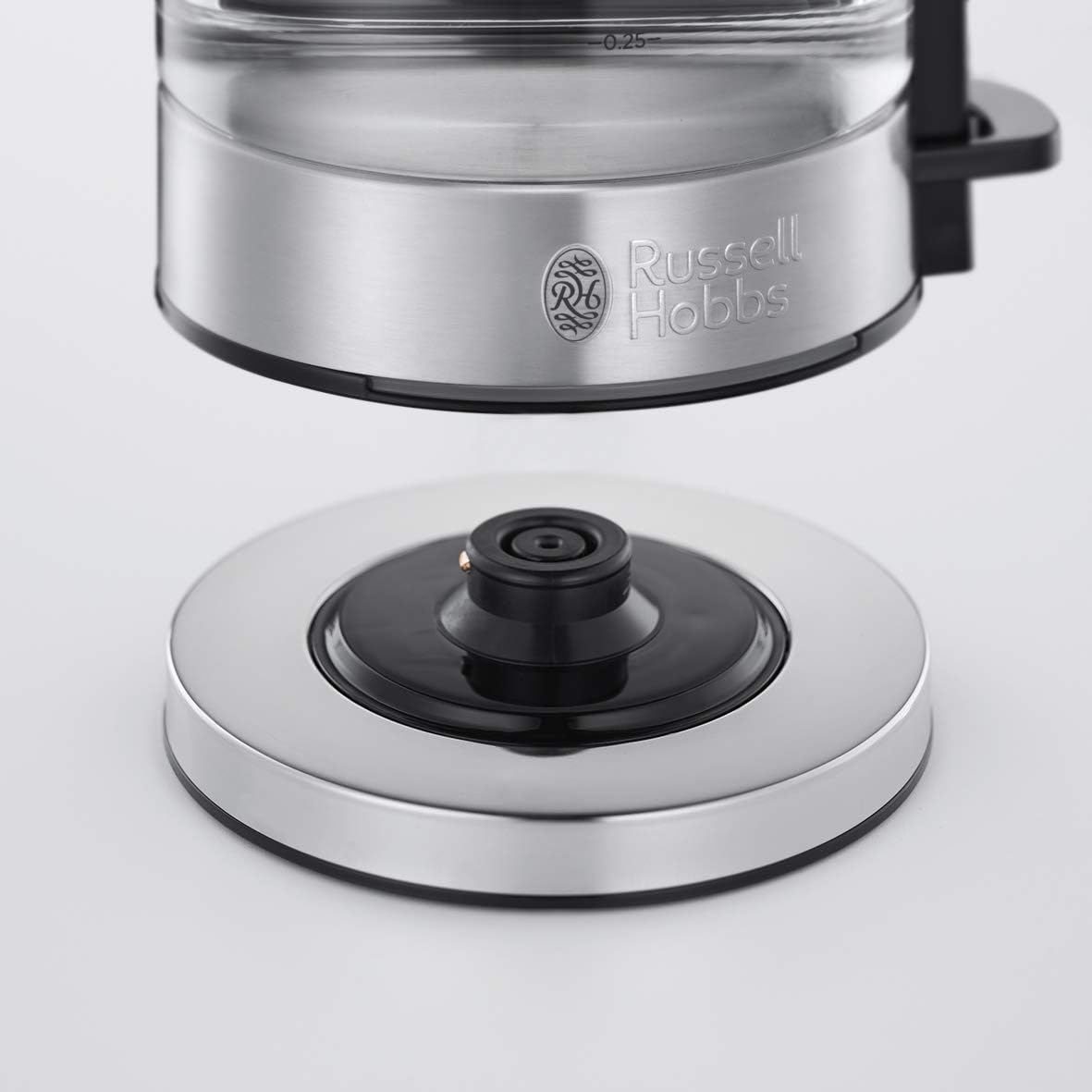 Компактна кана Russell Hobbs Mini Glass Kettle, 0.8 л, 2200 W, LED осветление, филтър за котлен камък, оптимизиран чучур за наливане, спестяваща място, малка кана за пътуване, компактна машина за чай