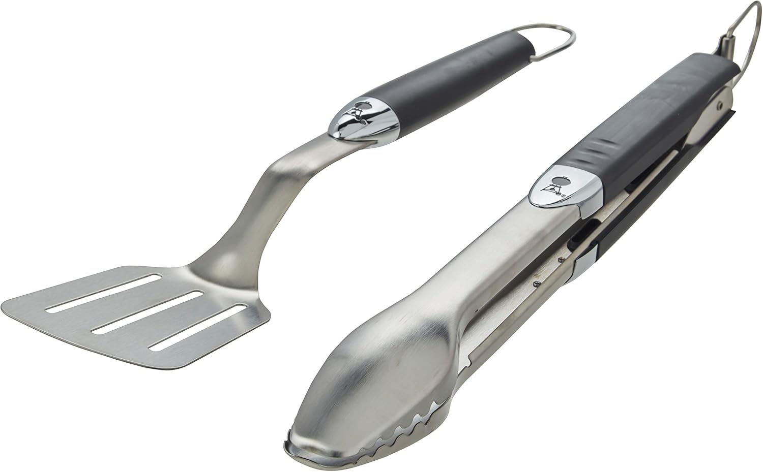 • Комплект прибори за барбекю за оптимално обръщане, състоящ се от щипки и шпатула