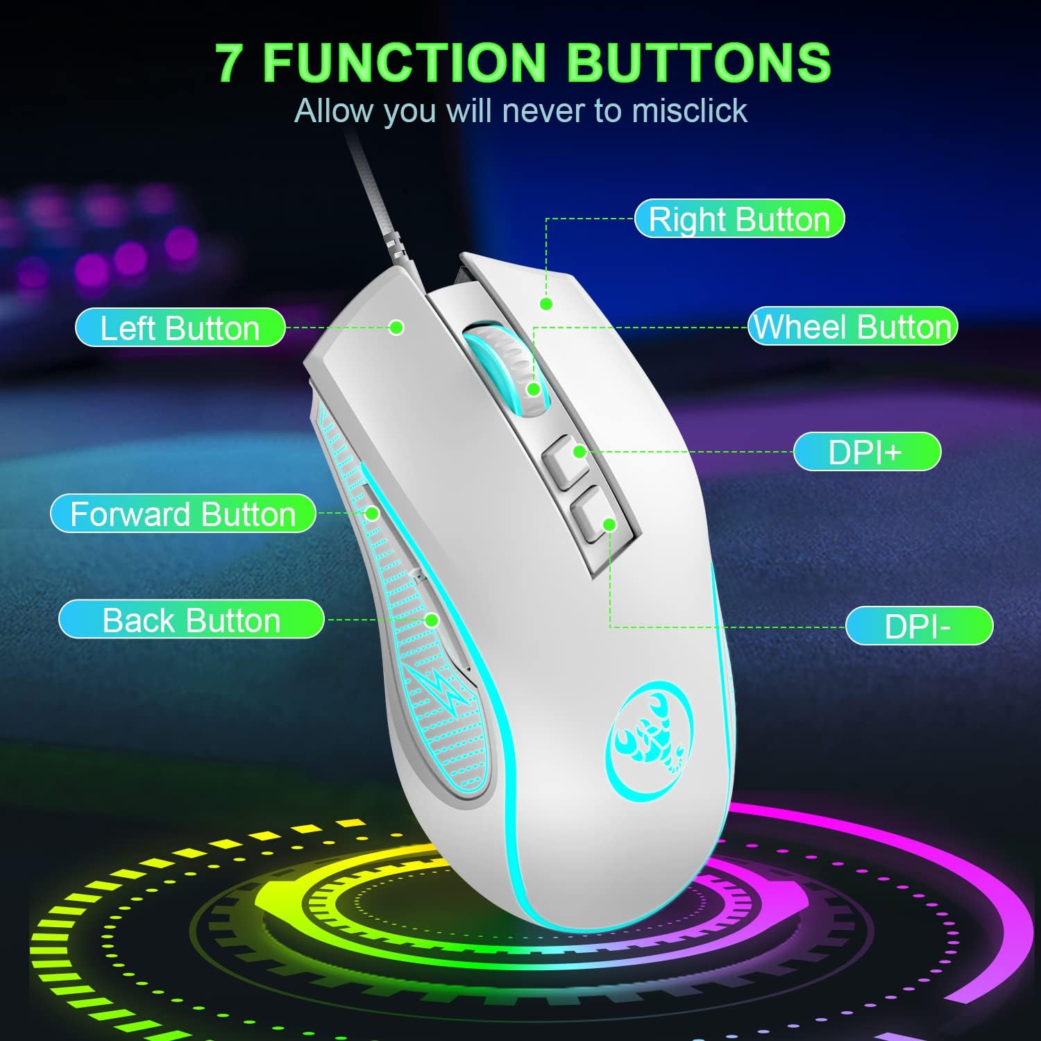 • Технология на оптичния сензор: оптичен сензор със 7-цветна подсветка и др., за да подчертае атмосферата на страницата по време на игра. Ако смятате, че включването на светлината е загуба на енергия или не е подходящо за работа, натиснете бутона DPI за 3 секунди, за да изключите или включите LED светлината.