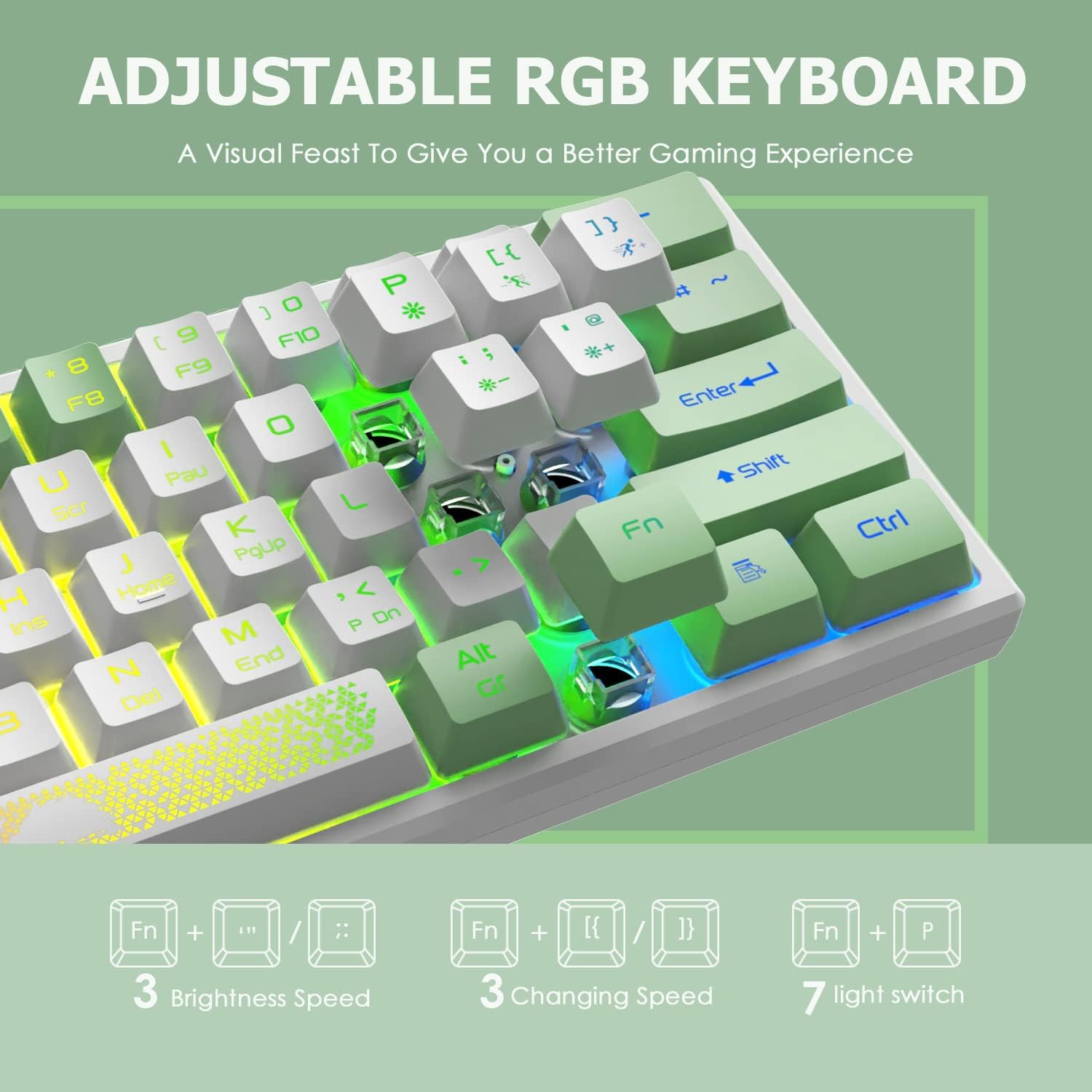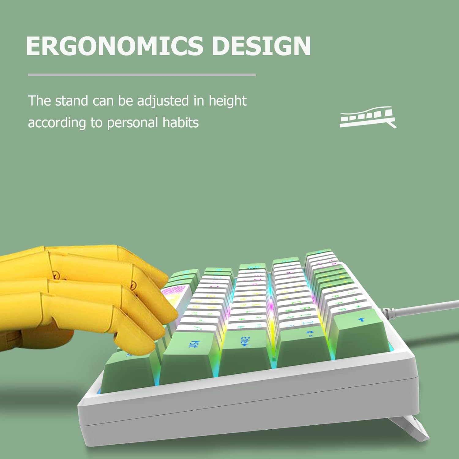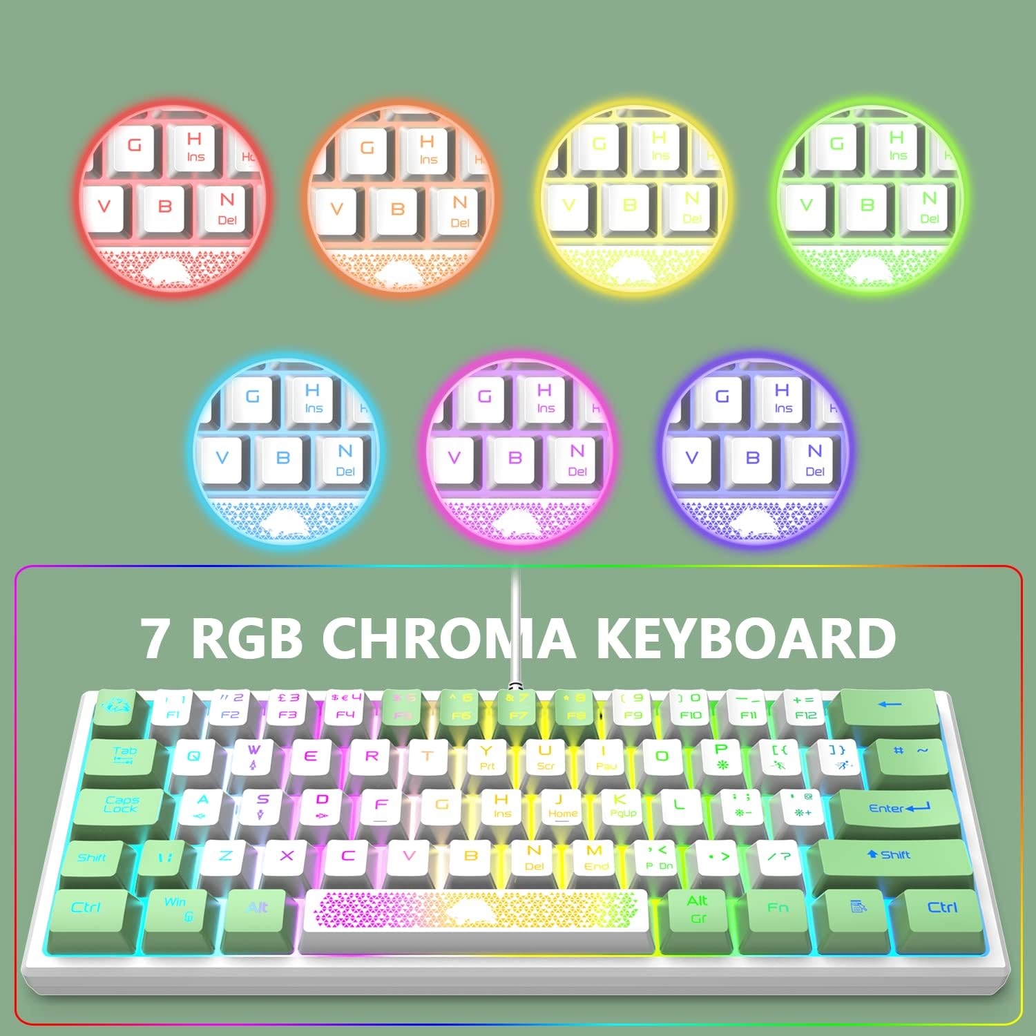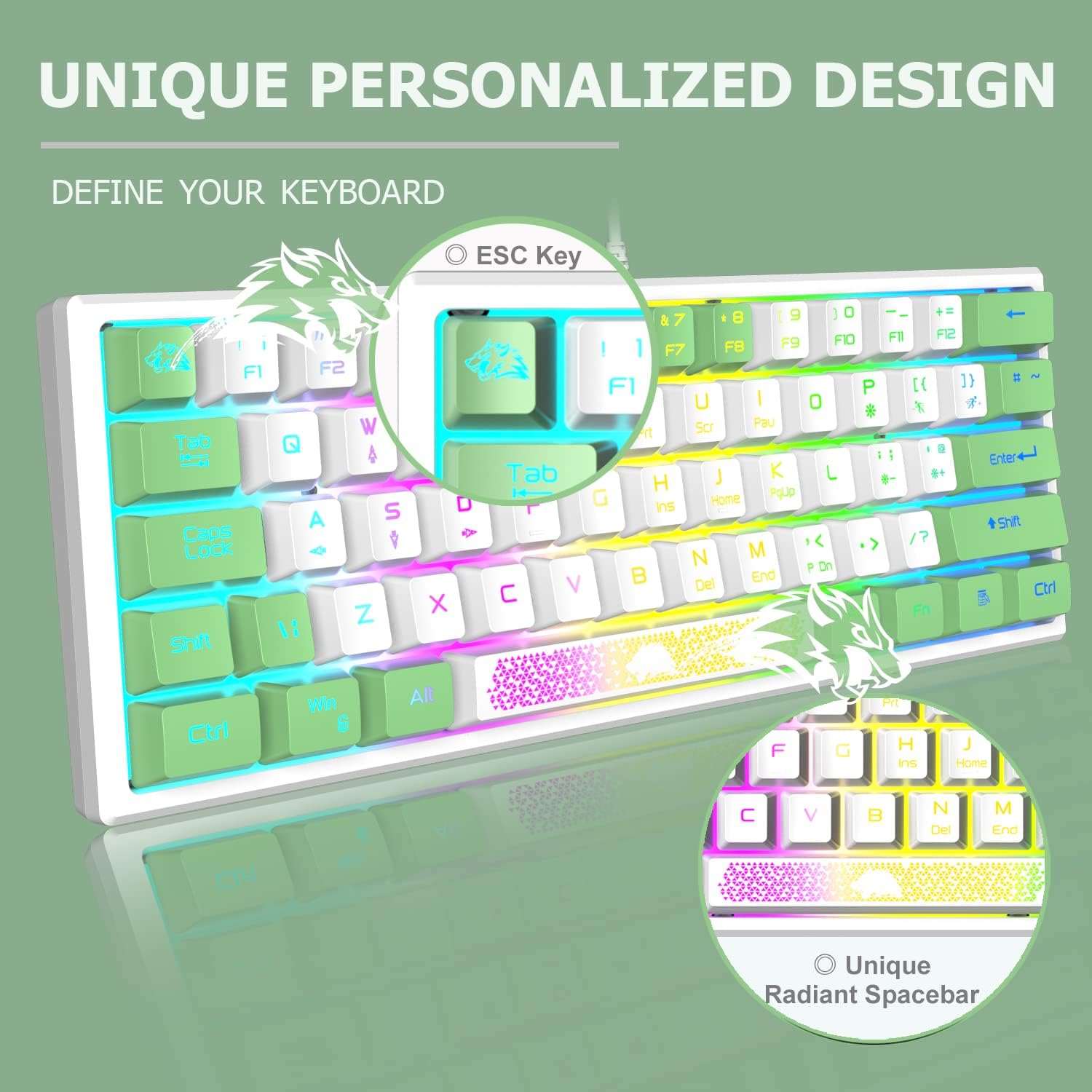 • 60% геймърска клавиатура: Мини компактна 62-клавиша, малък размер и големи функции. Компресира формата с 60%, без да прави компромис с функционалността на клавиатурата. Размерът е само 11,8 x 4,3 x 1,2 инча, може лесно да се инсталира дори в най-тясното пространство, осигурявайки ви комфортно гейминг изживяване.