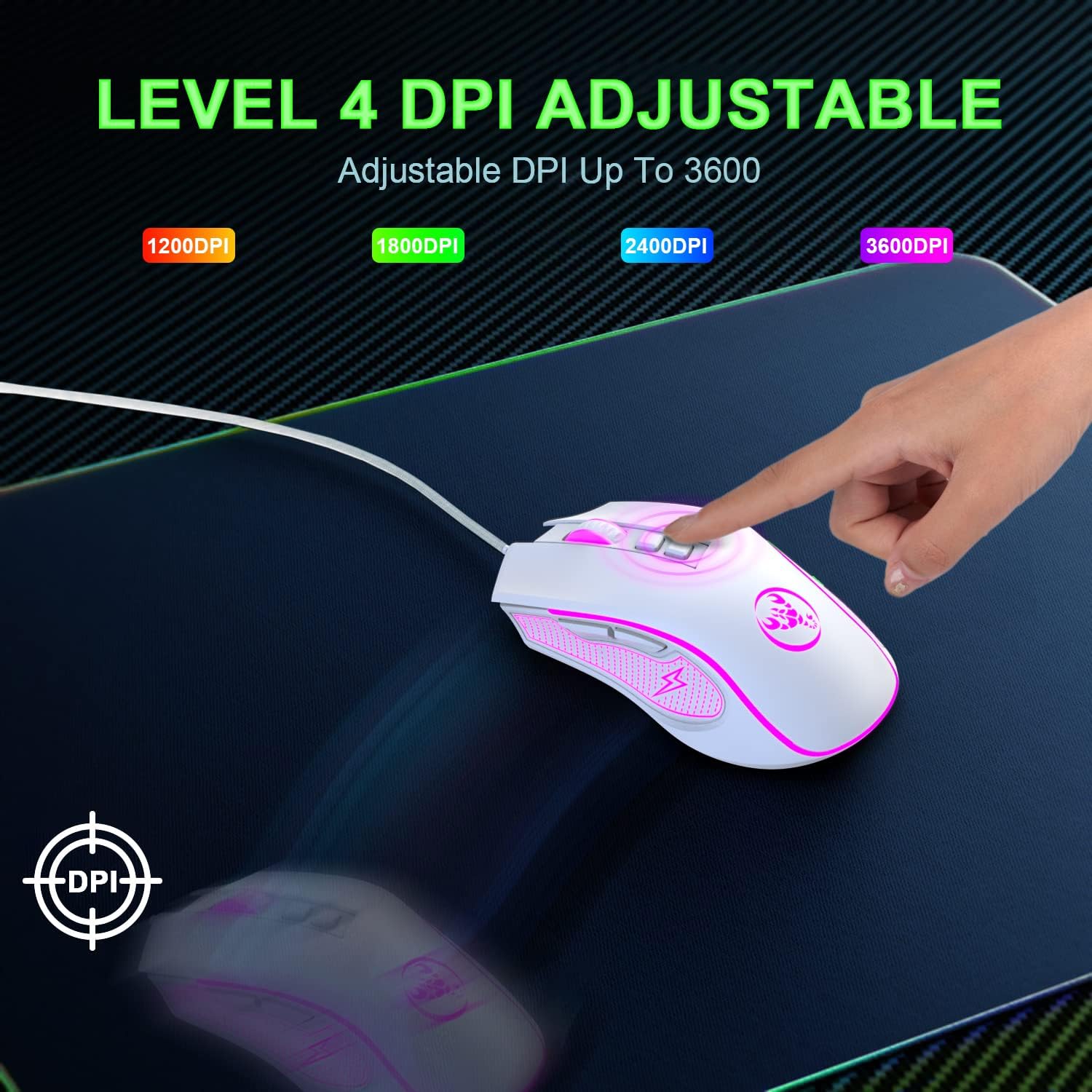 • 4 регулируеми DPI и гъвкави бутони: регулируем диапазон на скоростта на DPI: 1200-1800-2400-3600, лесно и удобно управление на скоростта. Plug and play, няма нужда от изтегляне на други драйвери. 7 бутона, ляв/десен/среден/напред/назад/DPI +/DPI. Регулируема чувствителност за игри и ежедневни бизнес нужди. Лесно настройване, за да се адаптира мигновено скоростта на мишката към различните игри.