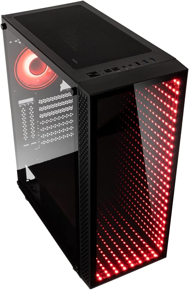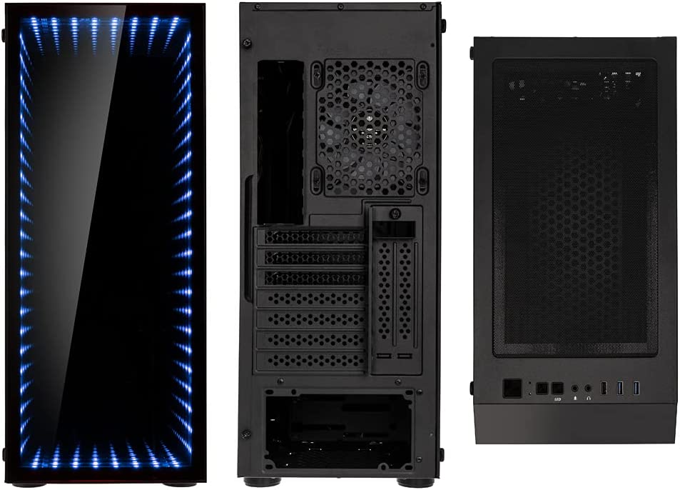 • Корпусът за компютър за игри има атрактивни странични панели от закалено стъкло и предната част с безкраен огледален ефект и ARGB подсветка, която може да се синхронизира с обичаен софтуер от производителите на дънни платки