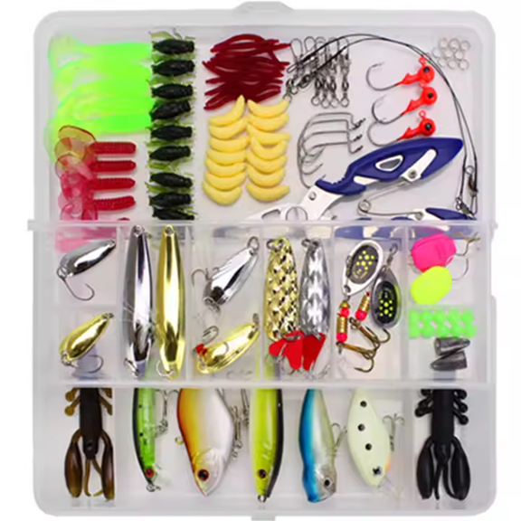 Кутия за риболов съдържаш 101 части. Комплекта съдържа всякакви видове по големина и грамажи изкуствени примамки като воблери, блесни, червеи, жаби, силиконово примамки, спининг, куки, стопери, и други.