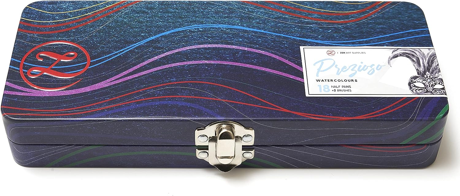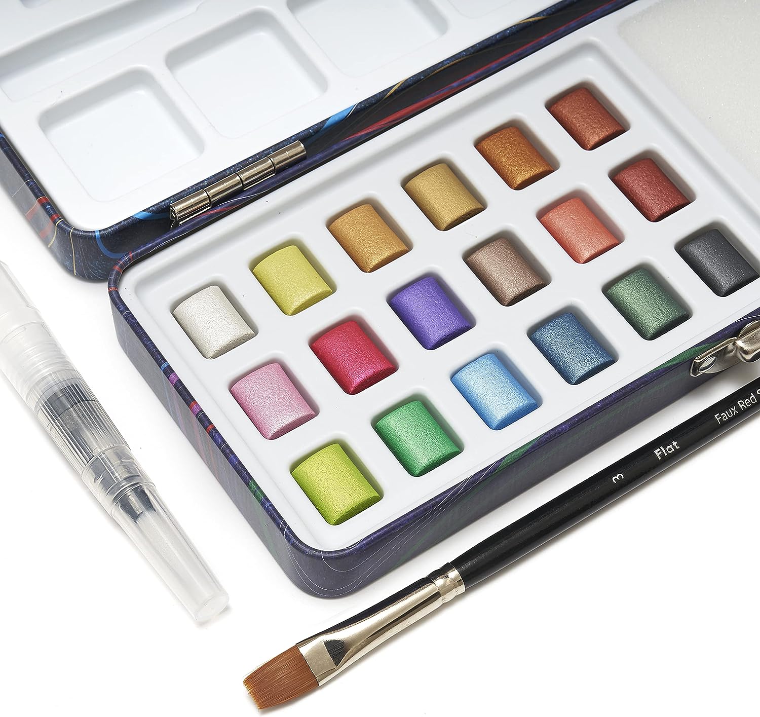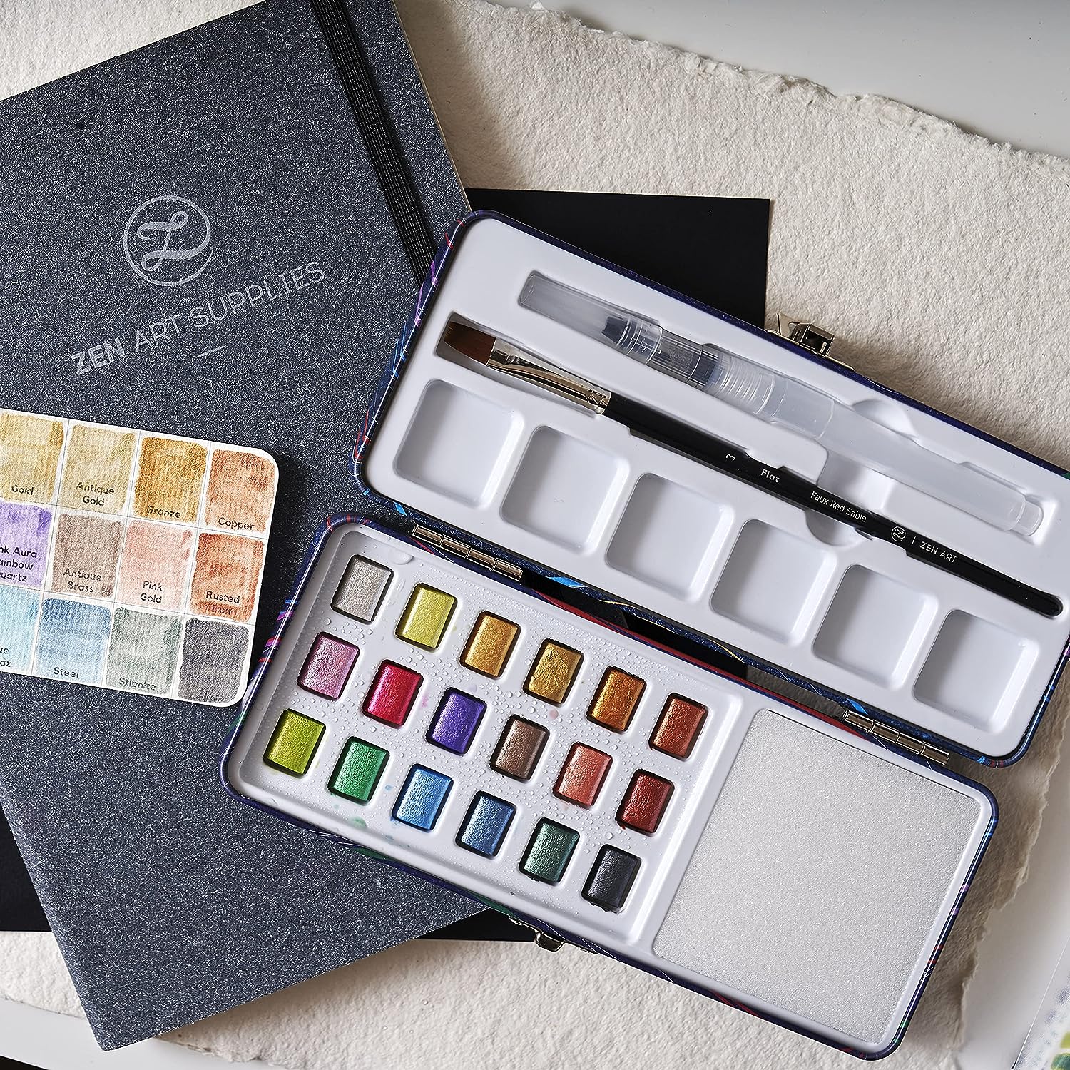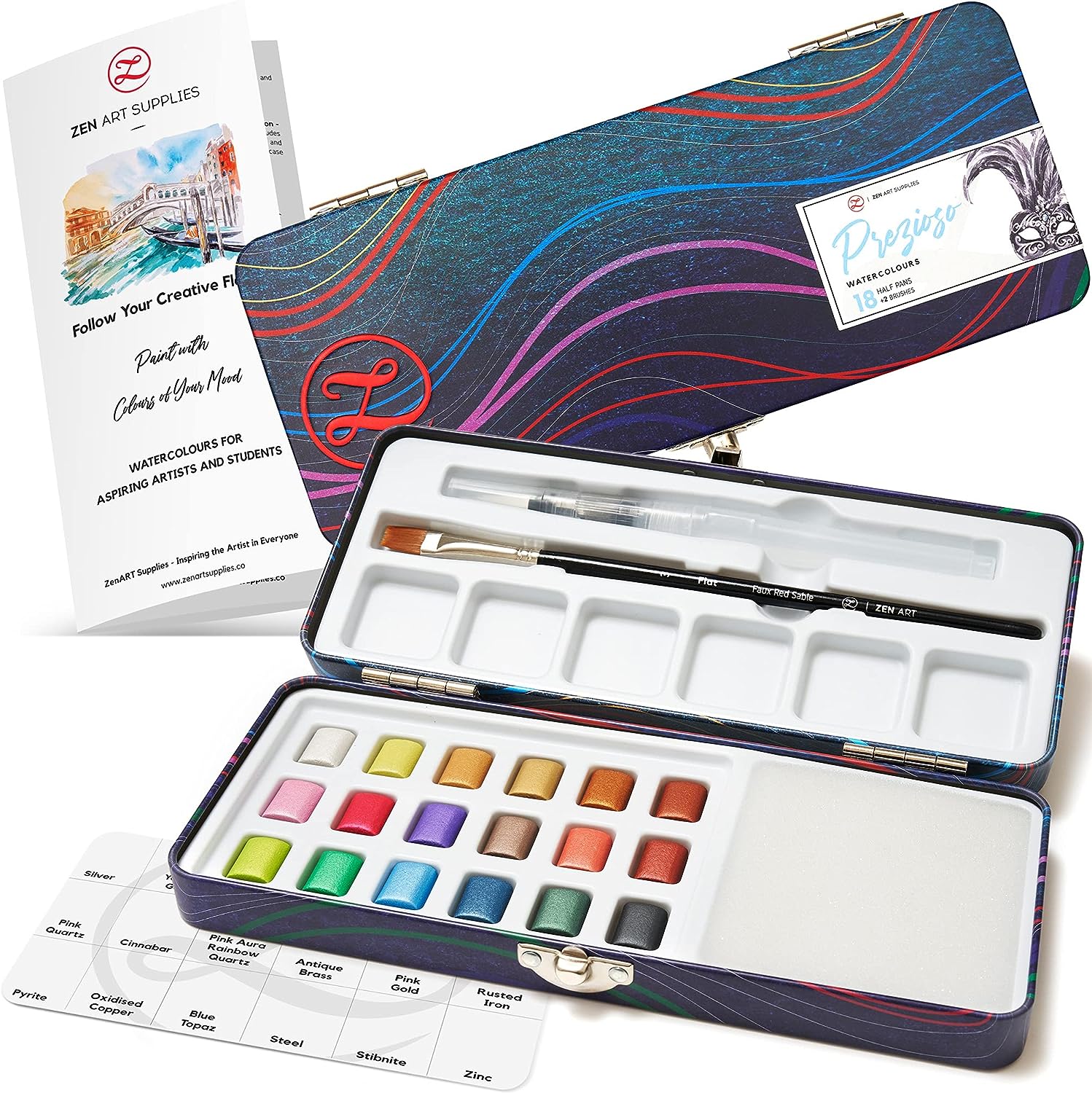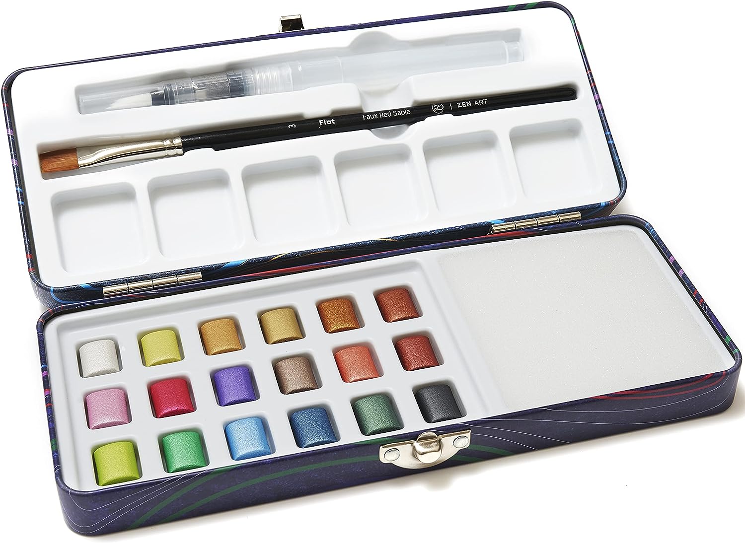 Комплект акварелни бои ZenArt Supplies, 18 цвята, Включва 2 четки и компактна кутия за съхранение