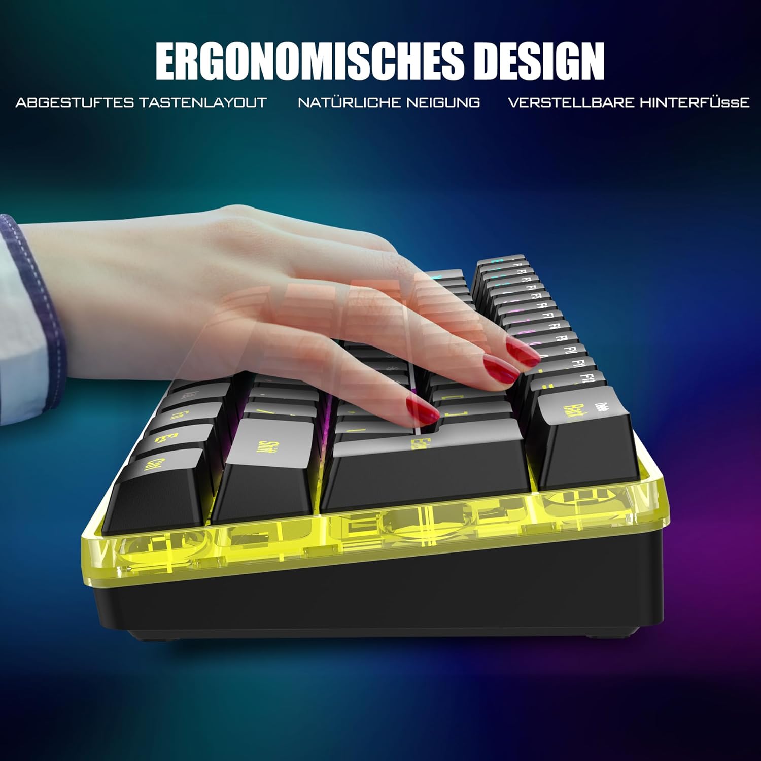 • 62-клавишна мини геймърска клавиатура и ултралека мишка с корпус тип „пчелна пита“: 60% ултракомпактното оформление ви предлага повече пространство за движение на мишката. Дори хора, които нямат нищо общо с минимализма, ще се потопят в нейния малък, функционален дизайн. Добре проектираната мишка с перфориран корпус тип „пчелна пита“ е ергономично проектирана и тежи само 65 (+-5) грама, което я прави по-гъвкава и удобна без умора.