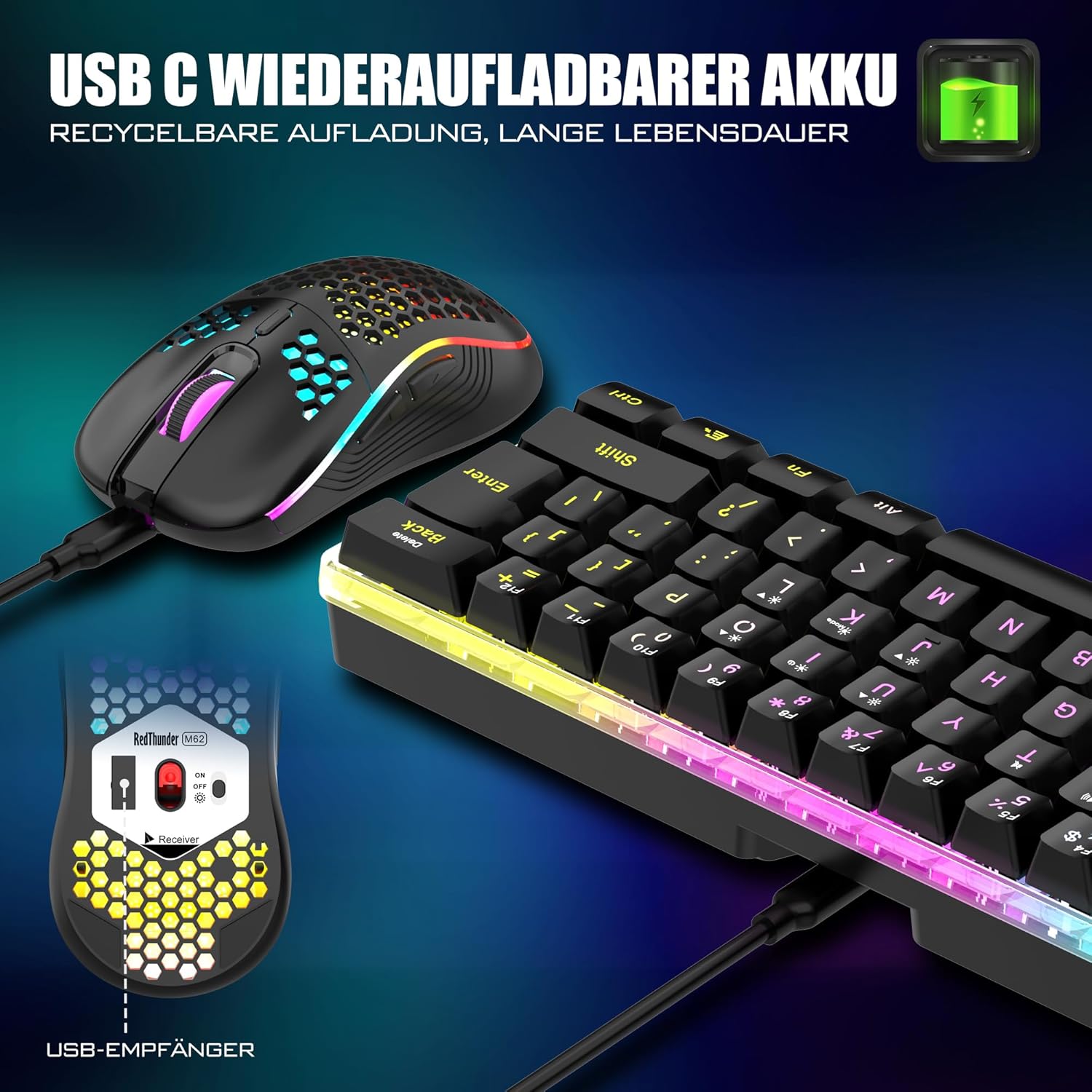 Комплект безжична геймърска клавиатура и мишка RedThunder 60%, QWERTZ DE Layout, презареждаща се безжична клавиатура с ултралека геймърска мишка с конструкция тип „пчелна пита“, за PC, Mac, PS5, Xbox, геймъри, офис