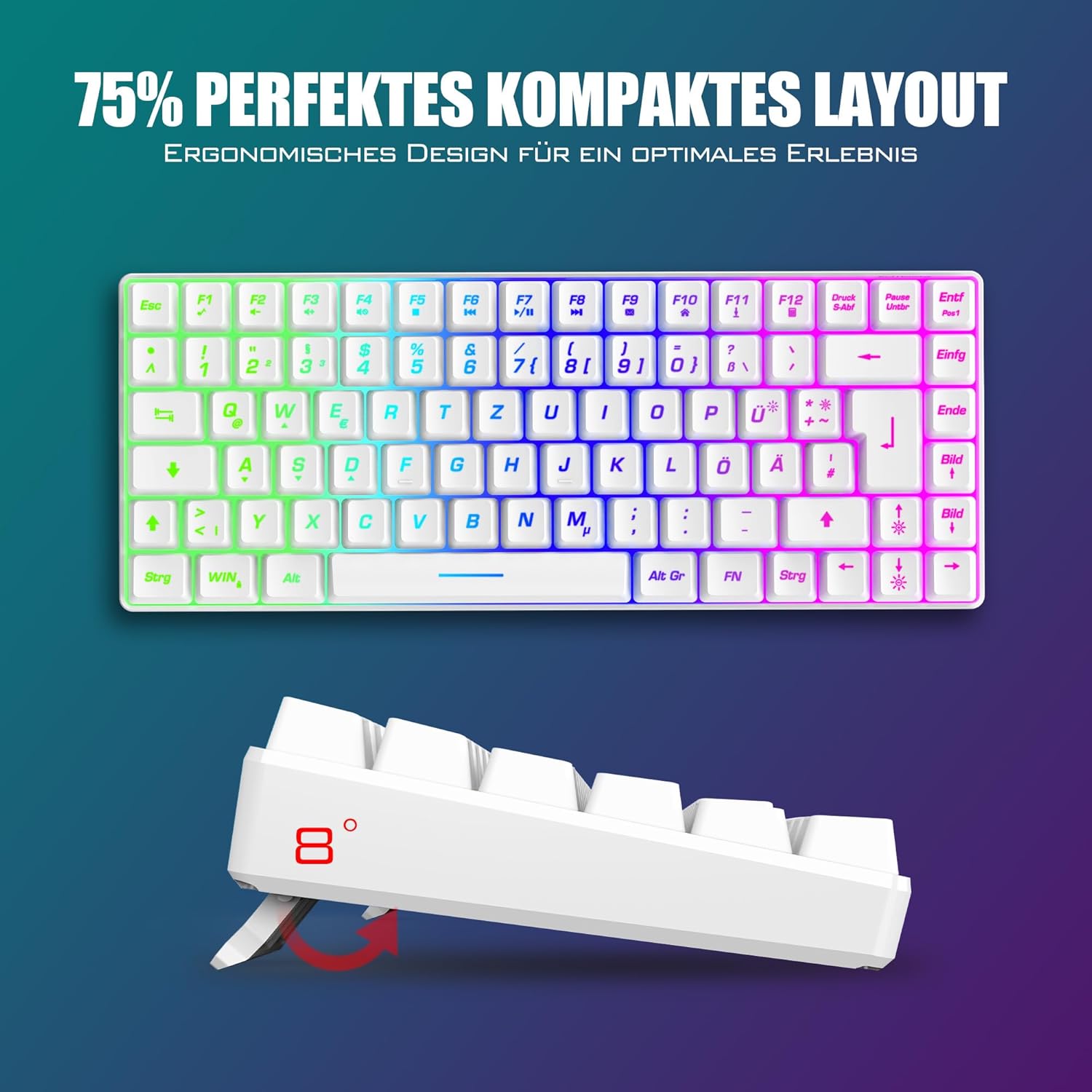 Комплект безжична геймърска клавиатура и мишка RedThunder 75%, QWERTZ DE разпределение, 85 клавиша, презареждаща се компактна мини TKL клавиатура, 7200DPI мишка с конструкция тип „пчелна пита“ за PC, Mac, PS5, Xbox, геймър [Бял]