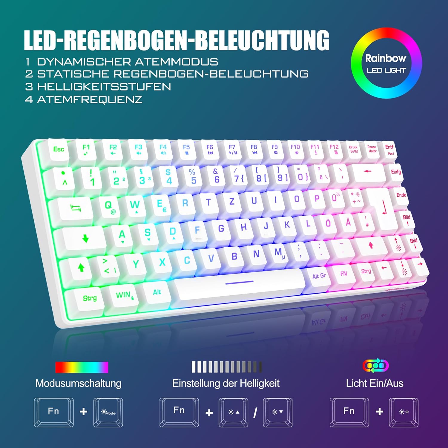 • Клавиатура и мишка с подсветка: Геймърската клавиатура K84 75% има 4 режима на LED подсветка, 4 нива на яркост, 3 фиксирани режима на осветление и 1 динамичен режим на подсветка. Осветеният дизайн на буквите и интервалите я прави най-добрата осветена безжична мини клавиатура на пазара. Мишката има вграден цикличен прогресивен светлинен ефект със 7 цвята.