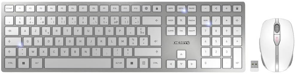 Комплект безжична клавиатура и мишка CHERRY DW 9100 SLIM, френска подредба (AZERTY), Bluetooth и 2.4GHz радио, тихи клавиши, презареждаща се, бяло/сребристо