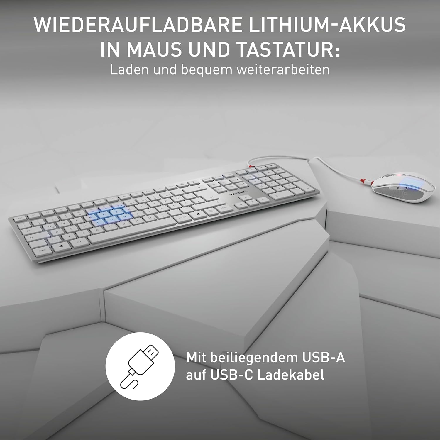 Комплект безжична клавиатура и мишка CHERRY DW 9100 SLIM, скандинавско разположение (QWERTY), Bluetooth и 2.4GHz радио, тихи клавиши, презареждаема, бяло/сребристо