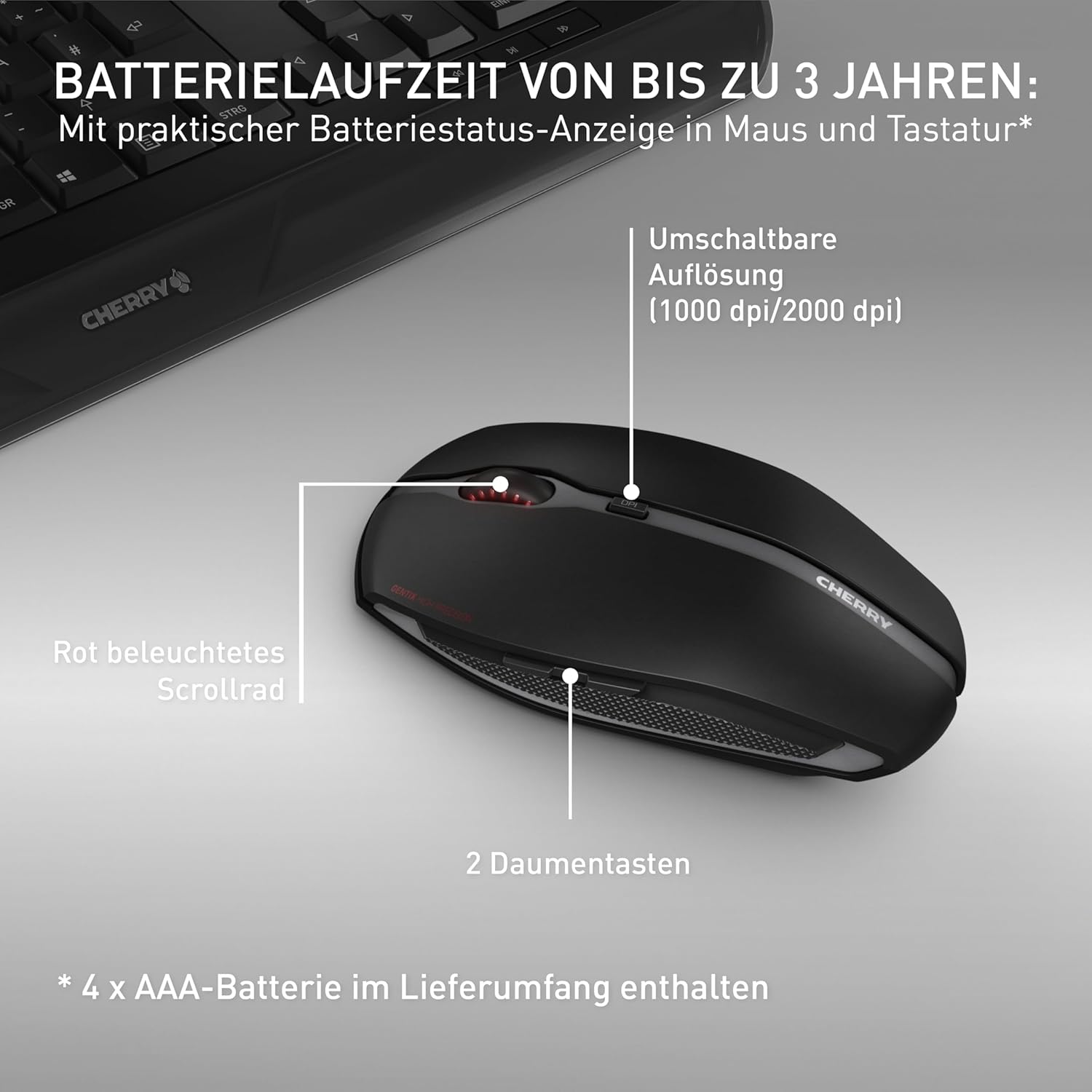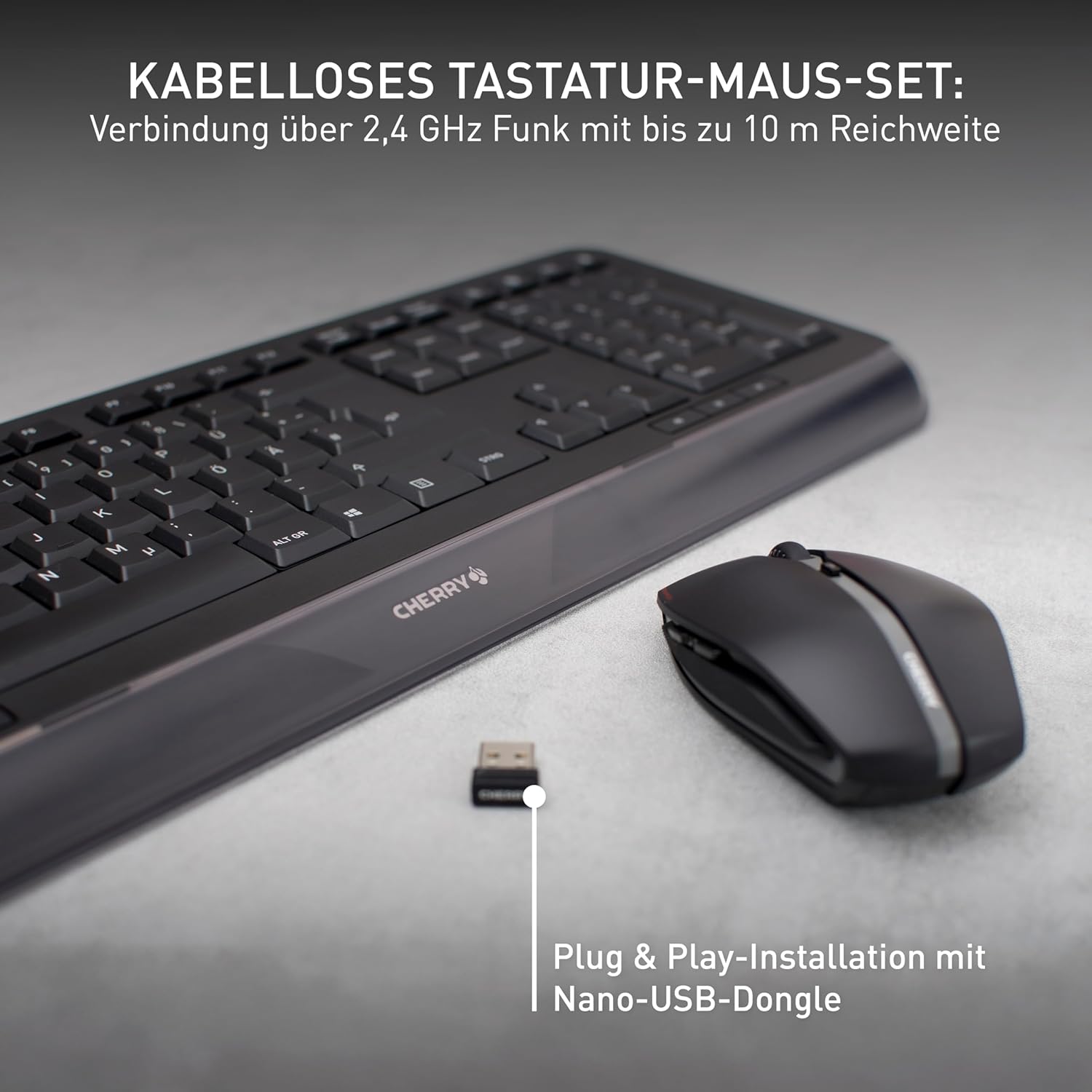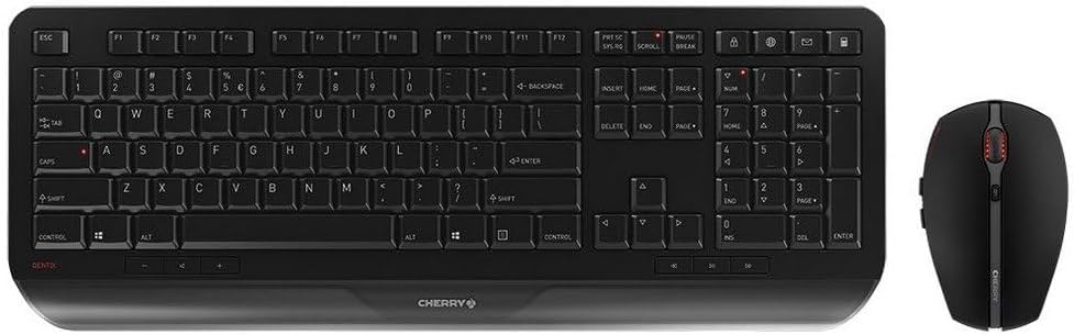 Комплект безжична клавиатура и мишка CHERRY GENTIX DESKTOP, френска подредба (AZERTY), 2.4GHz радио, вградена поставка за китката, симетрична мишка, черна