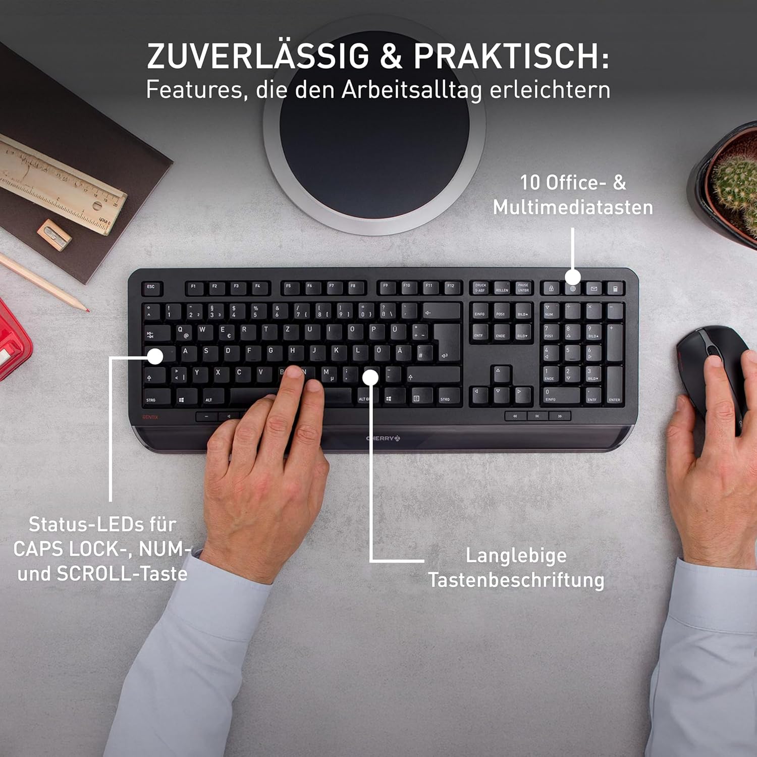 • 3 червени светодиода за състояние (клавиши CAPS LOCK, NUM и SCROLL), 3 стабилни крачета и издръжливи етикети на клавишите: Дори след години употреба, буквите са все още ясно четливи