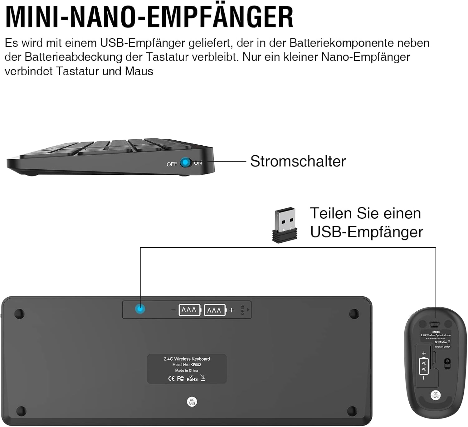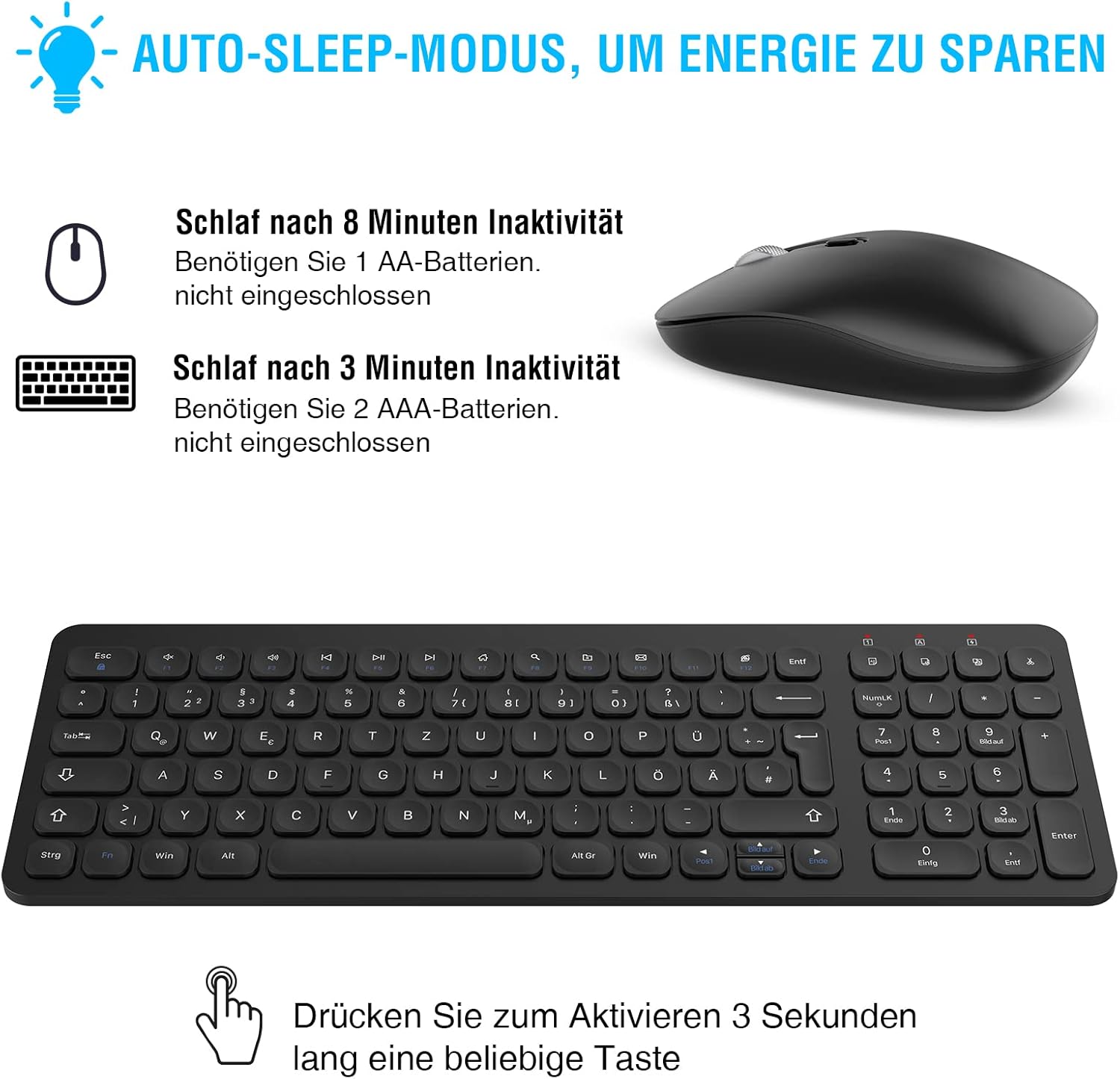 Комплект безжична клавиатура и мишка cimetech, 2.4G ултратънка безжична клавиатура с безжична мишка, QWERTZ немска подредба, обхват 10 м, за компютър, настолен компютър, лаптоп, Windows (черен)
