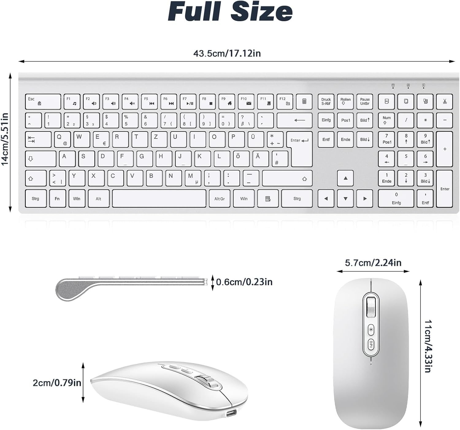 Комплект безжична клавиатура и мишка cimetech, ултратънка презареждаща се безжична клавиатура и мишка, ергономично QWERTZ разположение, ултратънка за компютър/настолен компютър/PC/лаптоп/Windows (сребриста)