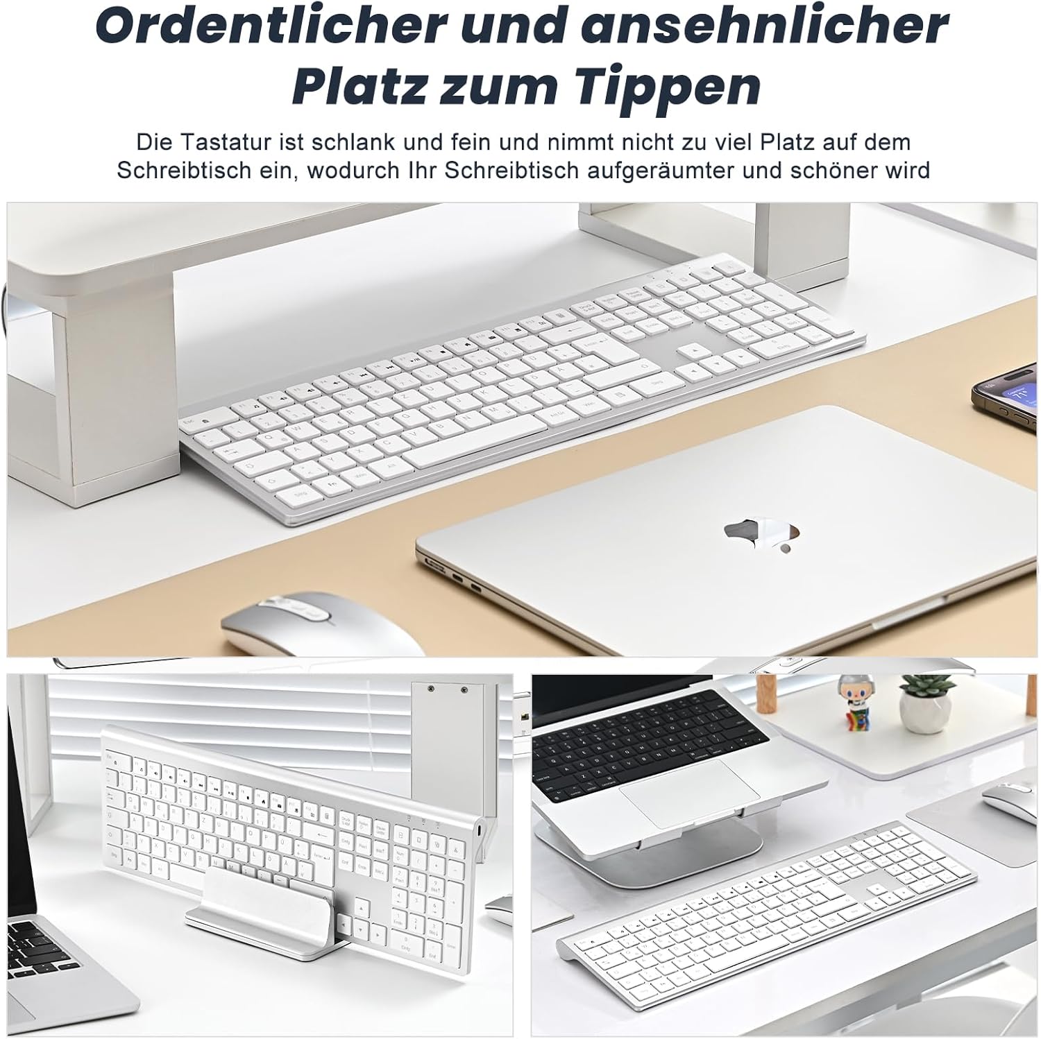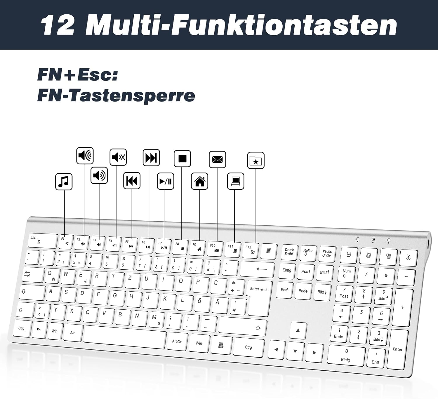 • 【ПЪЛНОРАЗМЕРЕН И ЕРГОНОМИЧЕН ДИЗАЙН】Ултратънка безжична клавиатура, ергономичен дизайн, тихо щракване, подходяща за всеки. Клавишите с форма на ножица правят писането удобно. Ъгловите клавиши поддържат ръката ви за часове удобна работа.