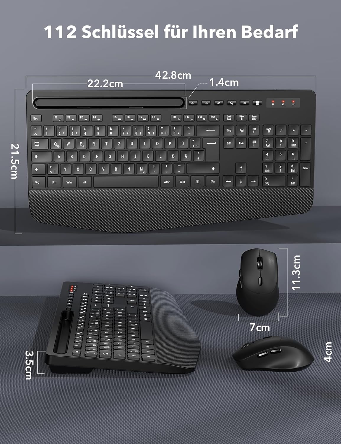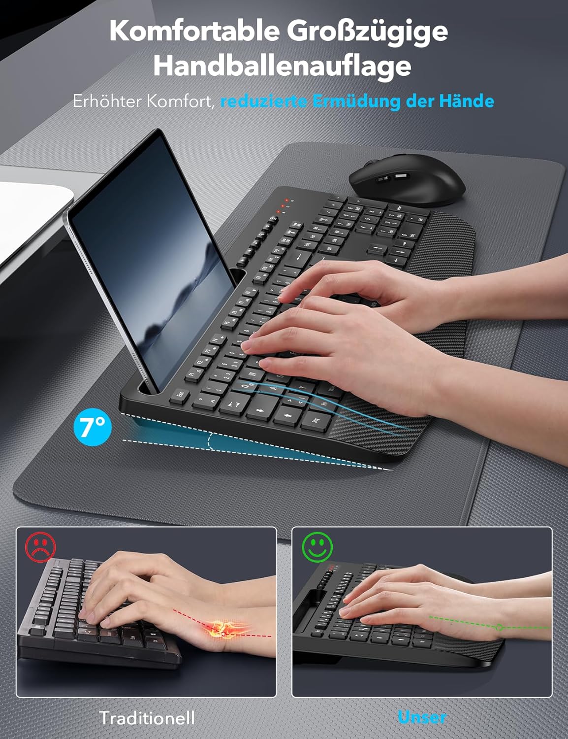 • 【СЪЗДАДЕНА ЗА КОМФОРТ】 - Ергономична клавиатура с щедра опора за длани и накланящи се крачета за по-добра позиция при писане, за да се намали натиска върху китката. Безжичната мишка предлага абсолютен комфорт с ъгъл на ръкостискане, контурирани дръжки и висококачествено матово покритие. 【ЗАБЕЛЕЖКА:】Клавиатурата няма Bluetooth функционалност.