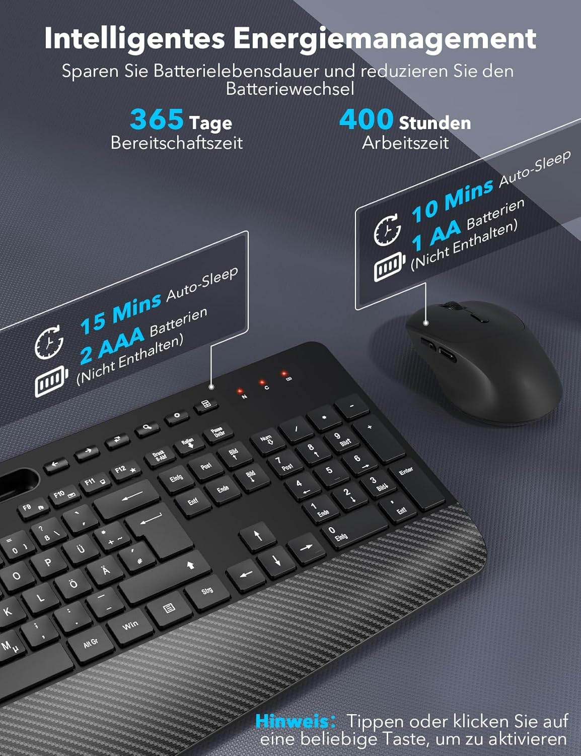 • 【ЕНЕРГИЙНА ЕКСПЕСТЯЦИЯ И ИЗДРЪЖЛИВОСТ】 - Безжичната мишка и клавиатура разполагат с интелигентен режим на заспиване, за да пестят енергия. Ако не сте активни в продължение на 15 минути, клавиатурата преминава в режим на заспиване. Ако не сте активни в продължение на 10 минути, мишката преминава в режим на заспиване. Натиснете произволен клавиш, за да се събудите. Можете да работите с месеци, без да се налага да сменяте батерии. Клавиатурата изисква 2 x AAA батерии, мишката - 1 x AA батерия. (Батерията не е включена)
