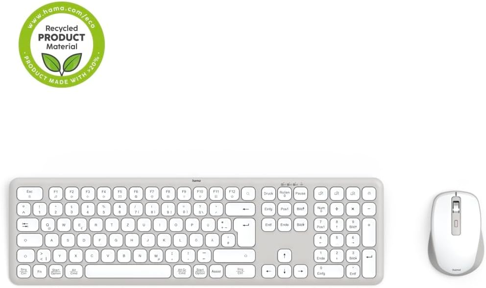 Комплект безжична клавиатура и мишка Hama (за множество устройства 2.4 GHz чрез USB приемник + 2 x Bluetooth за компютър, лаптоп, таблет, обхват 10 м, немска QWERTY подредба, без щракане, работи с батерии) бял