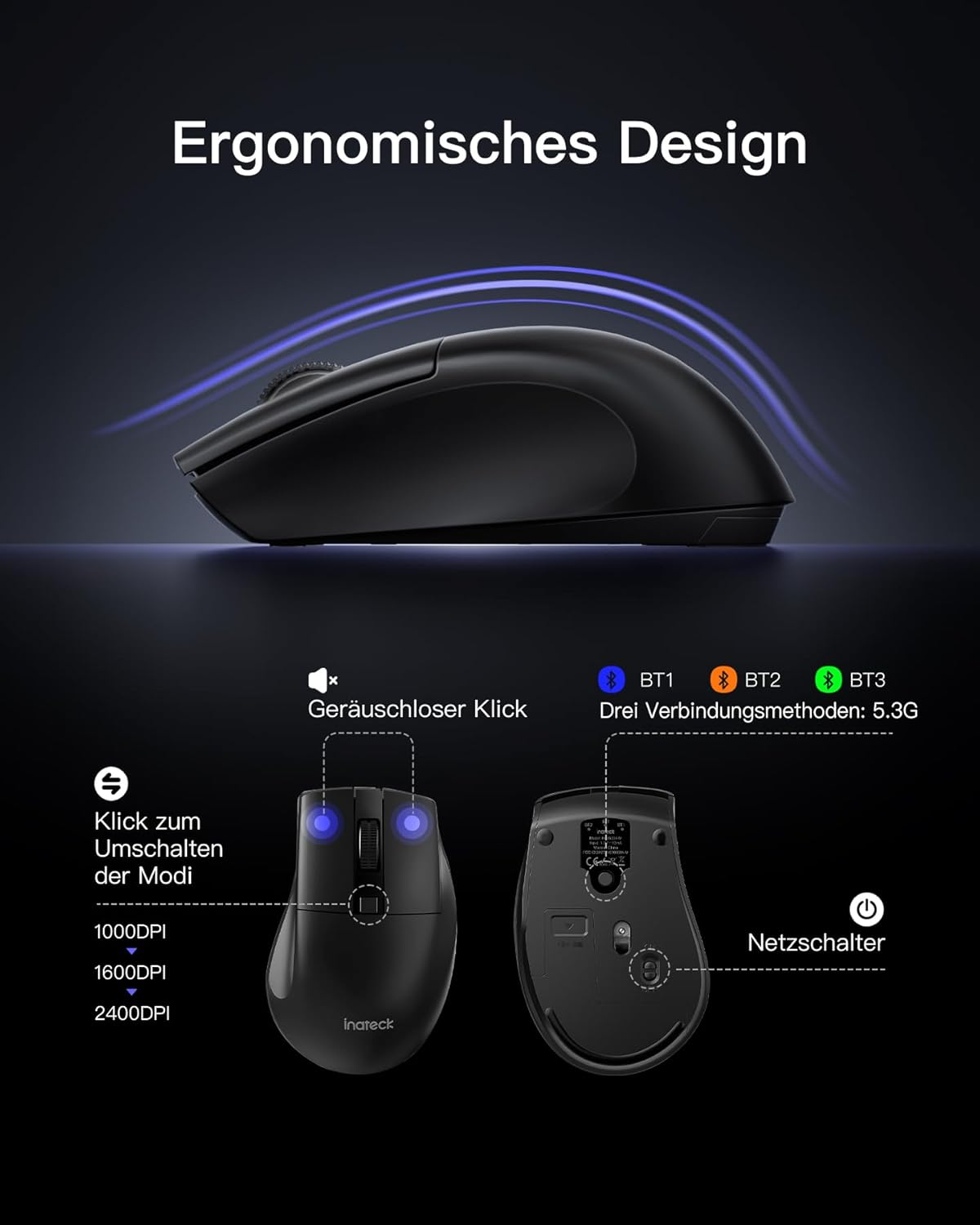 • Превключване между 3 устройства: 3 Bluetooth канала позволяват на тази Bluetooth клавиатура лесно да превключва между таблети, телефони и компютри. Конфигурирайте съответните клавиши, автоматично разпознавайте различни устройства и автоматично се свързвайте с предишно сдвоеното устройство следващия път, когато го използвате. [Забележка:] Мишката Inateck също така разполага с 3 Bluetooth канала, което ви позволява да я използвате с една клавиатура за безпроблемно превключване между различни системи и устройства.