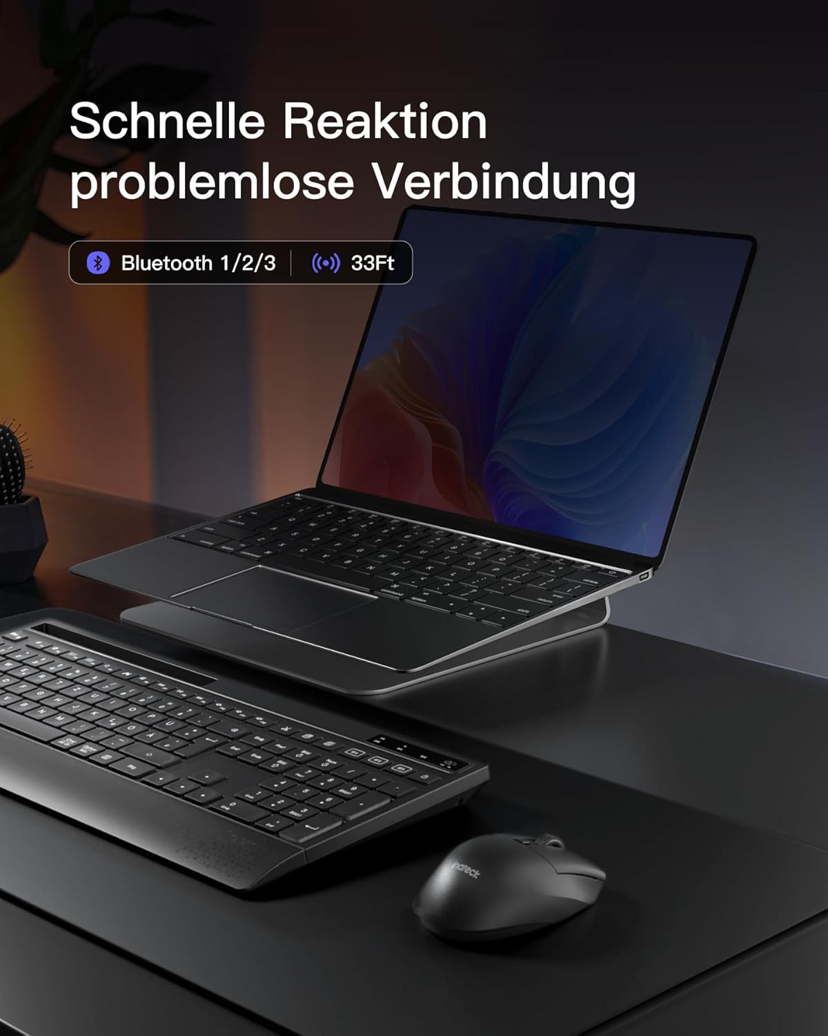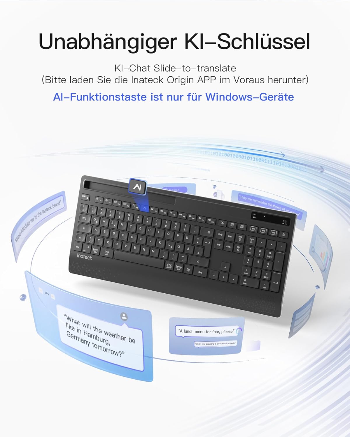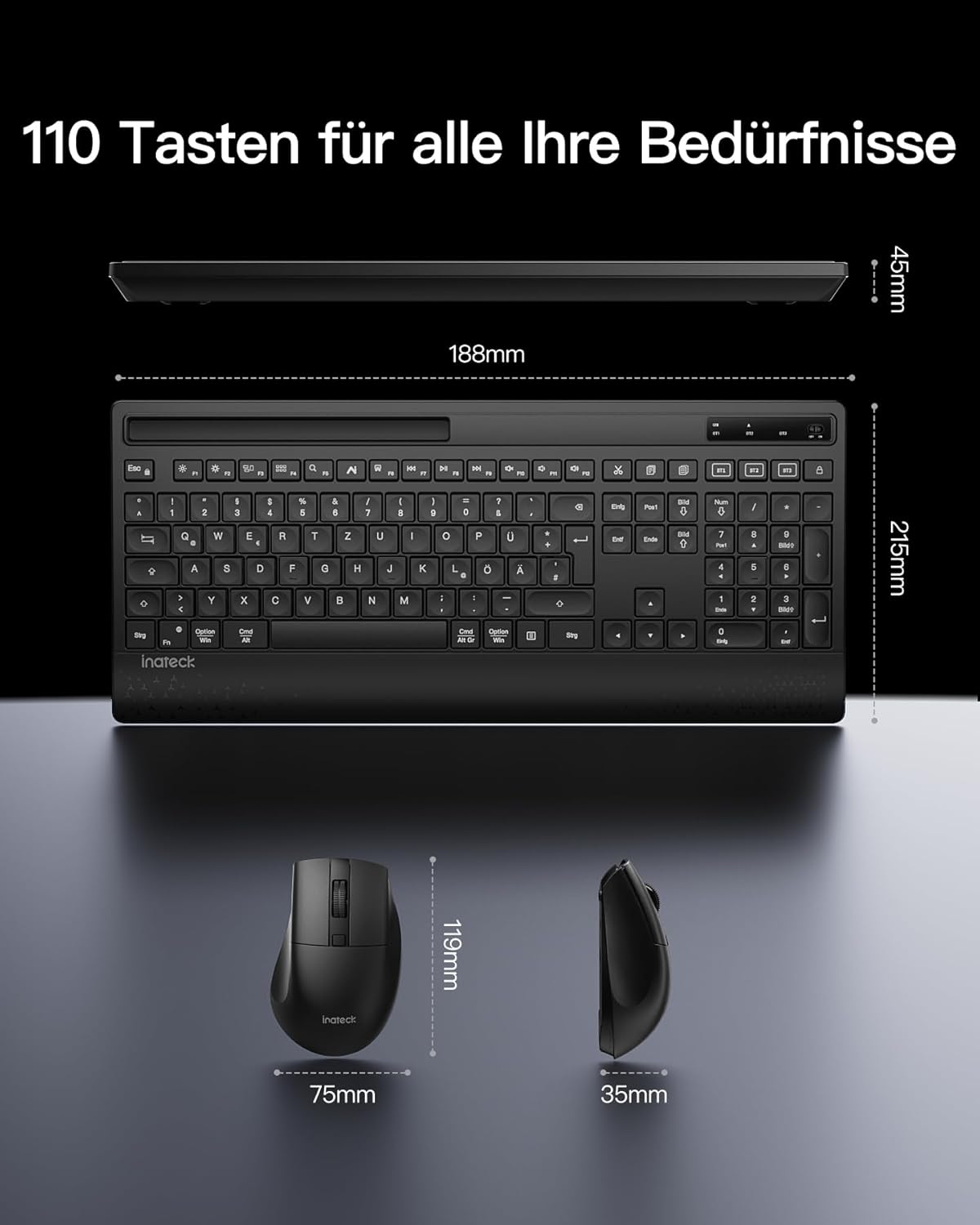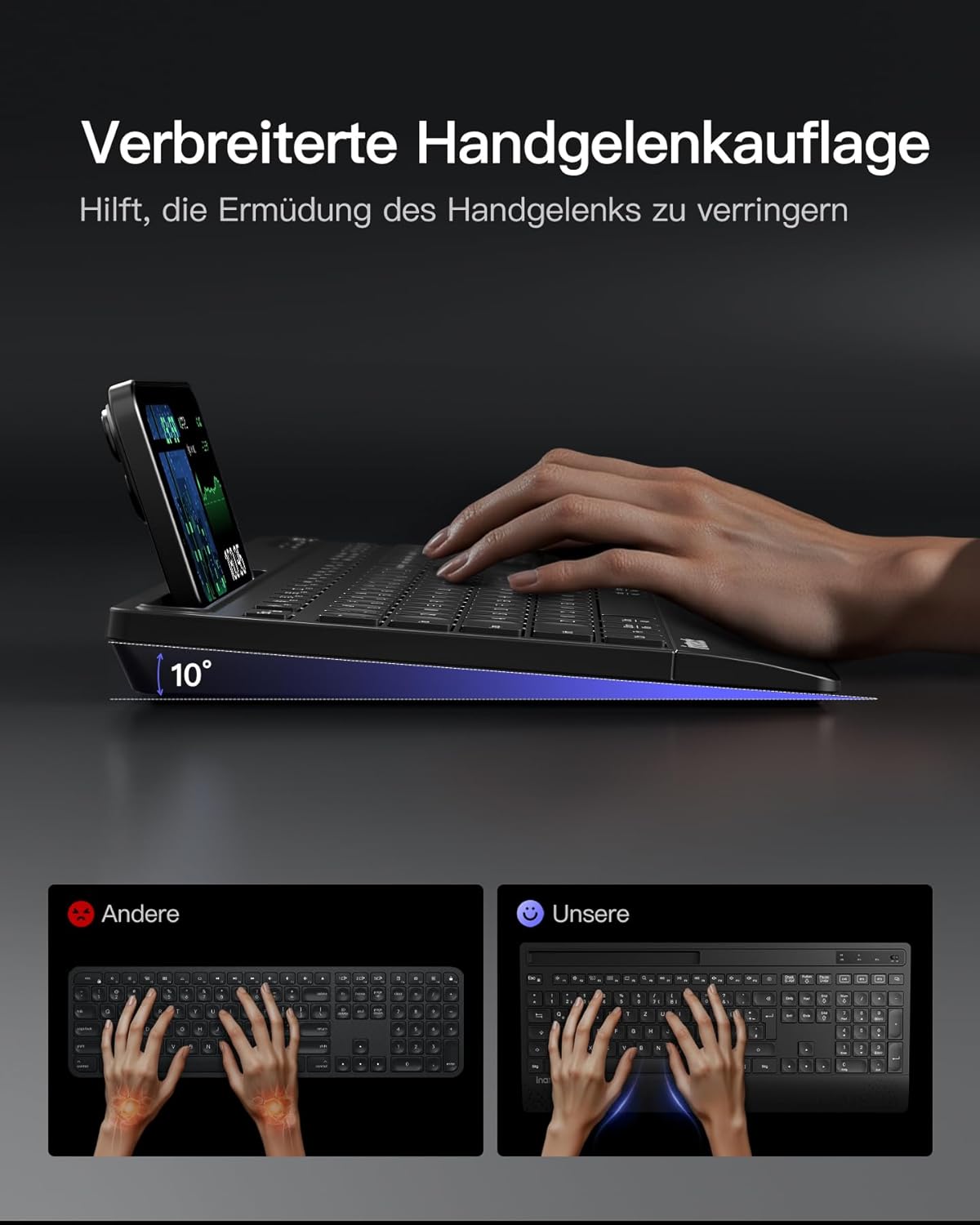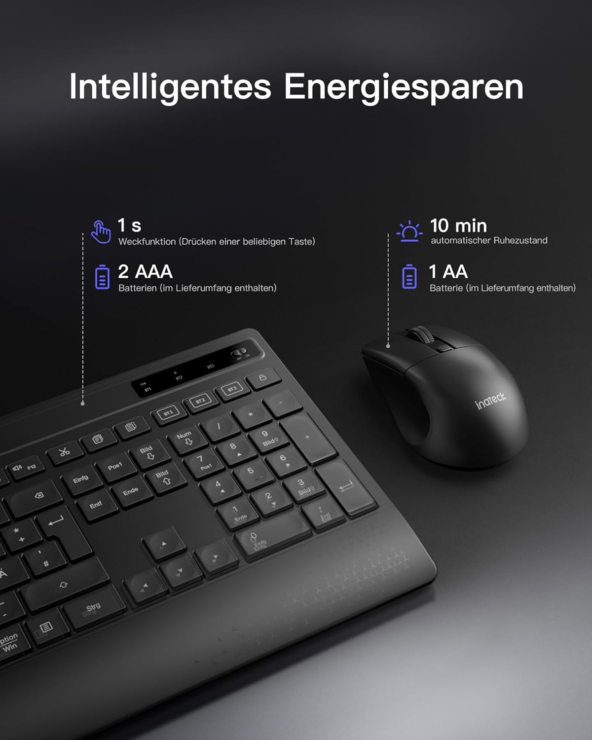 Комплект безжична клавиатура и мишка Inateck, пълноразмерна QWERTZ клавиатура, 3 Bluetooth връзки, с поставка за китката, AI функция, безшумна клавиатура за Mac, Windows, лаптоп, компютър, Smart TV, KB06006