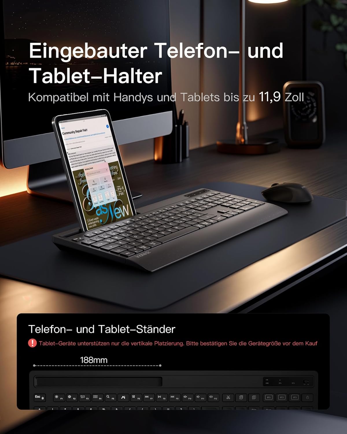 • Пълноразмерна с поставка за длани: Тази безжична комбинация от клавиатура и мишка включва пълноразмерна клавиатура с вградена стойка. Стойката здраво поддържа вашия телефон или таблет и осигурява удобна позиция за проверка на имейли, редактиране на документи или гледане на видеоклипове. Едновременно с това увеличава вашата работна ефективност и забавление.