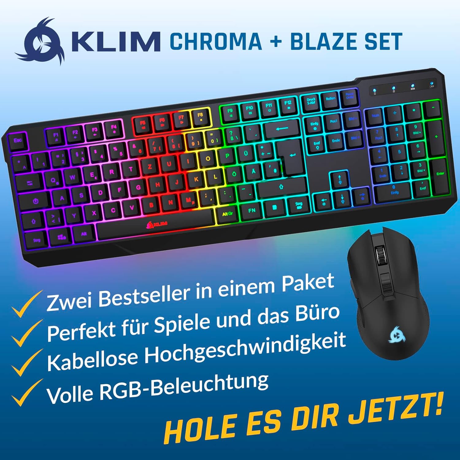 Комплект безжична клавиатура и мишка KLIM Blaze & Chroma, QWERTZ, плоска ергономична мишка за компютър, вградена батерия с дълъг живот