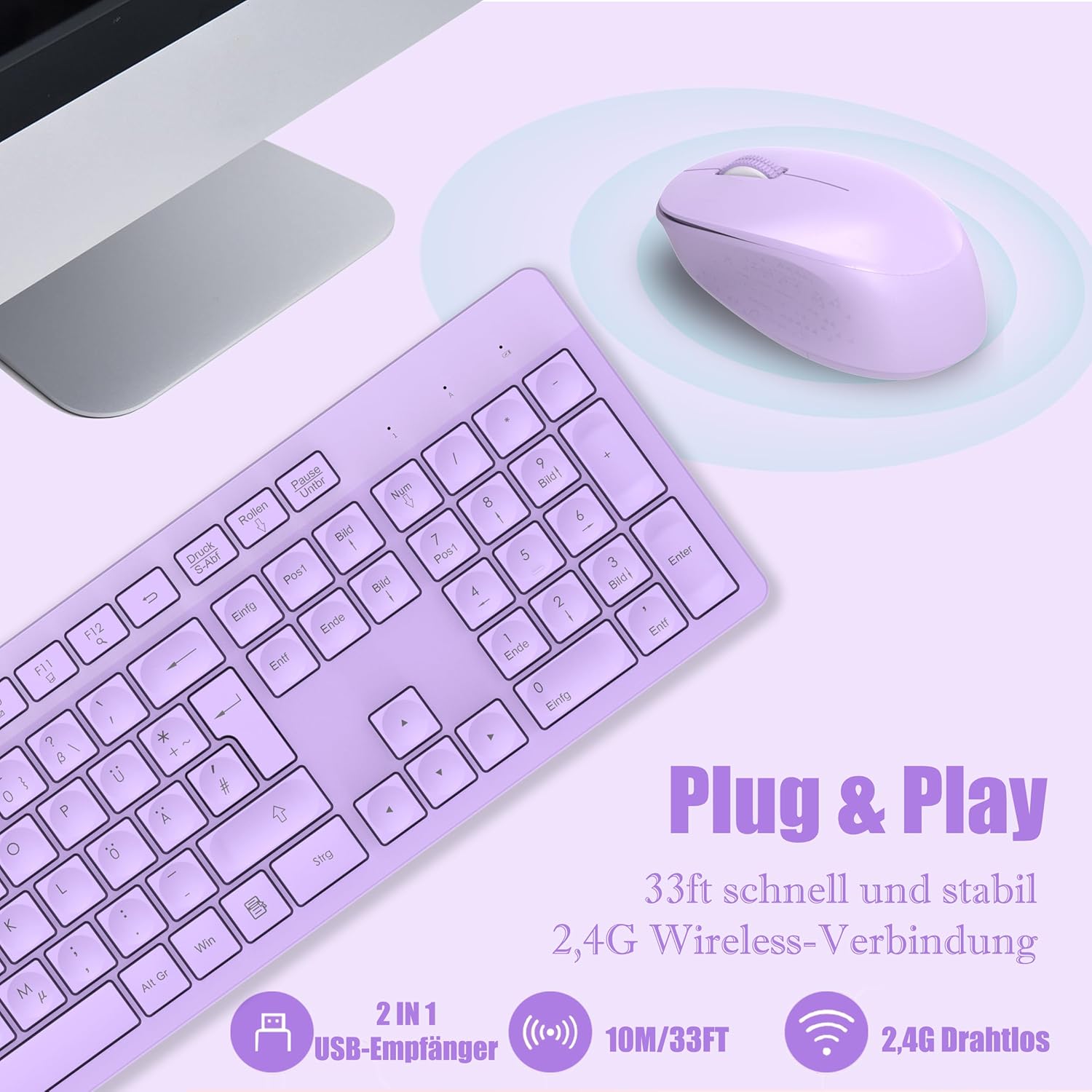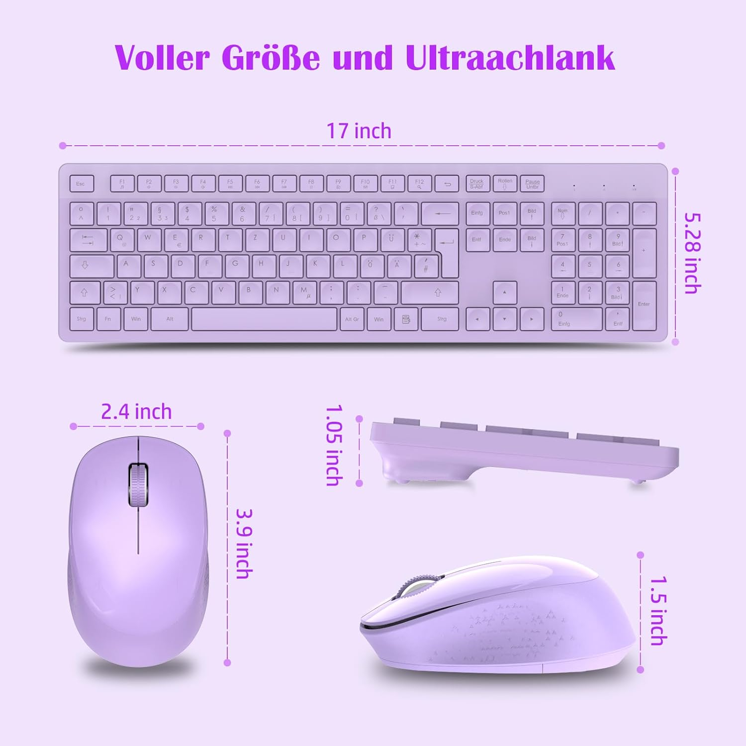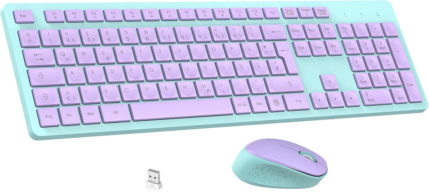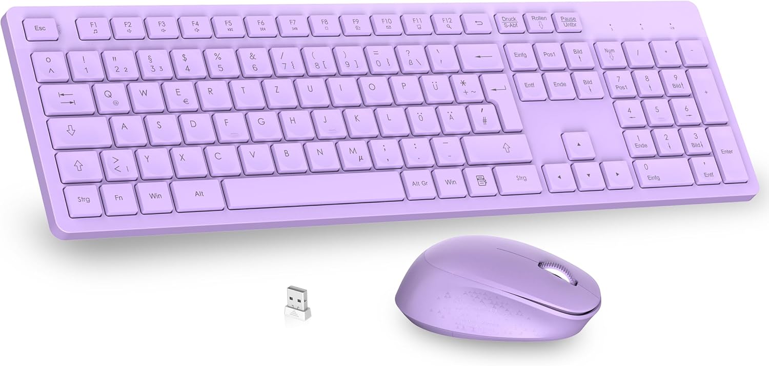 Комплект безжична клавиатура и мишка LeadsaiL K786 с цифрова клавиатура QWERTZ, немска тиха клавиатура Whisper, 2.4 GHz безжична мишка и клавиатура, 2-в-1 USB Nano приемник за компютър/лаптоп (лилав)