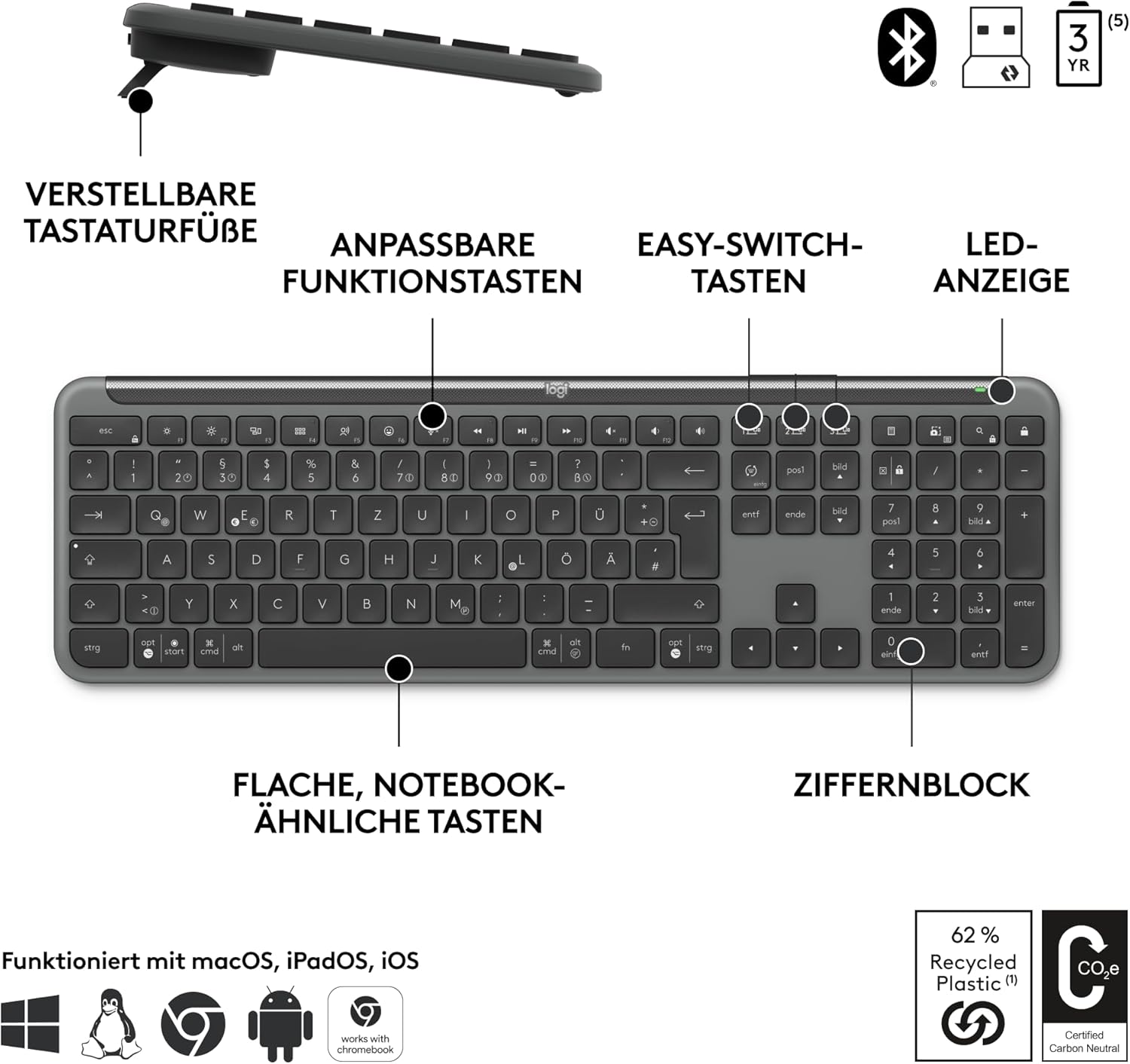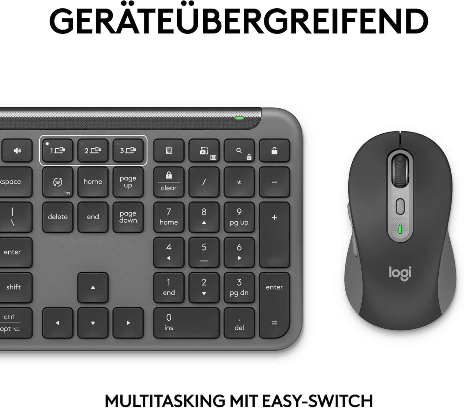 • На различни устройства: Многозадачността е лесна: Свържете се безжично чрез Logi Bolt или Bluetooth и превключвайте безпроблемно между три от вашите устройства, като просто натиснете бутона Easy-Switch.