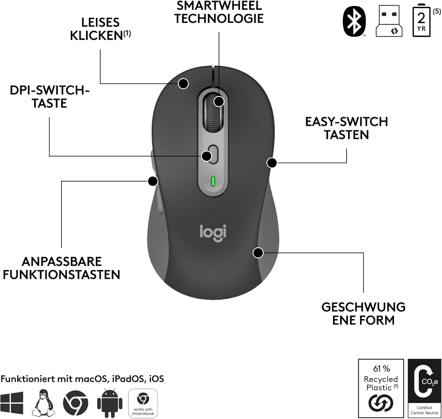 • Корпоративна сигурност: Безжичната технология Logi Bolt елиминира опасенията за сигурността с BLE; оборудвана с режим „Само защитени връзки“; включен е приемник Logi Bolt