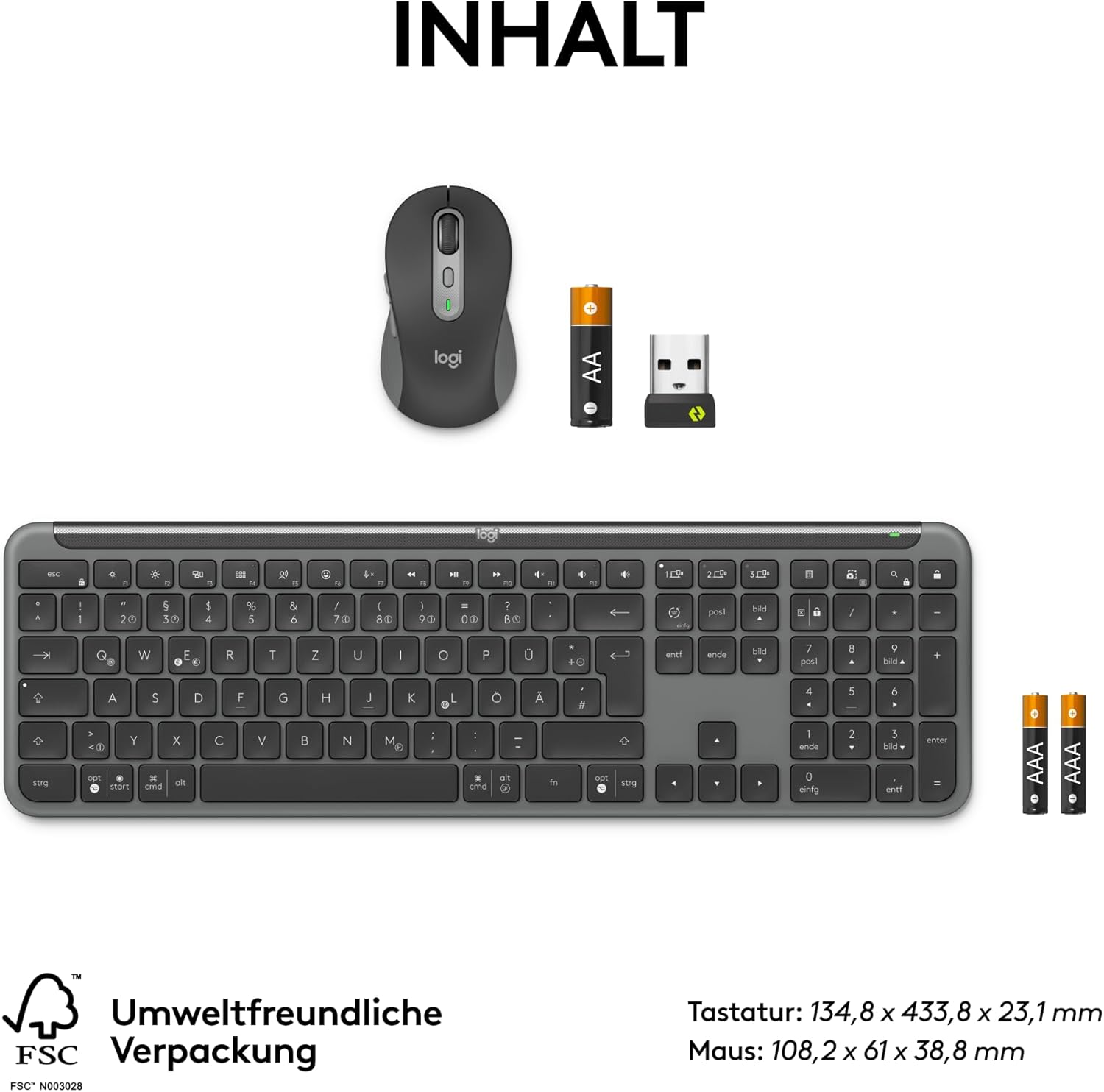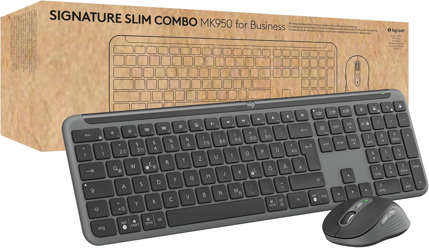 Комплект безжична клавиатура и мишка Logitech Signature Slim MK950 for Business, тихо писане, сигурен приемник, Bluetooth, световно сертифициран, Windows/Mac/Chrome/Linux, немска QWERTZ подредба, графит