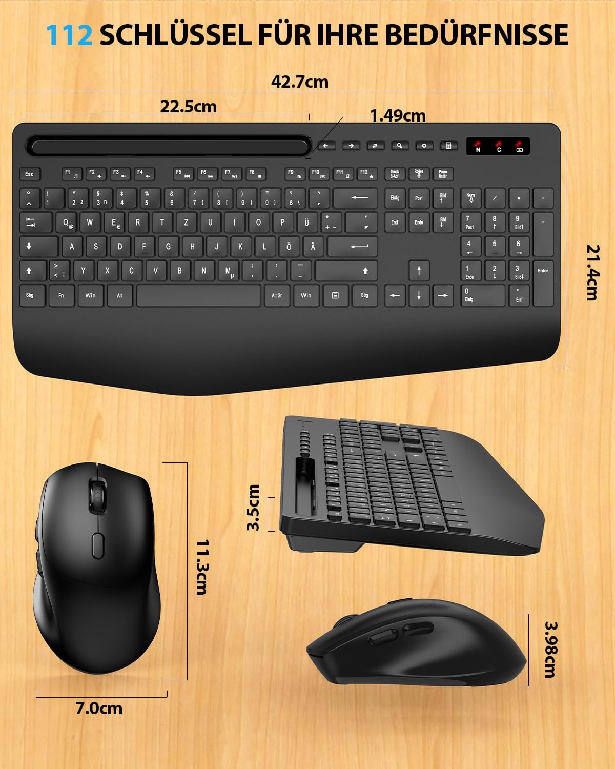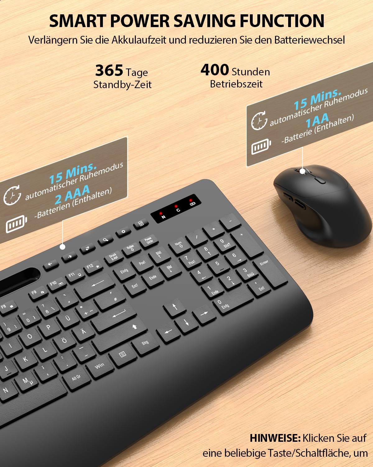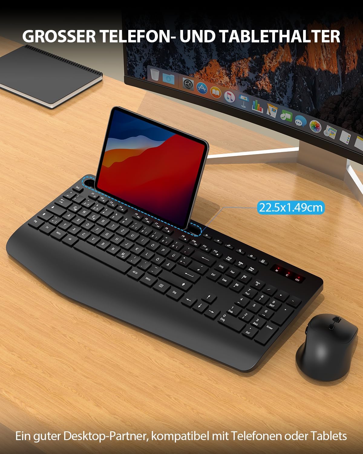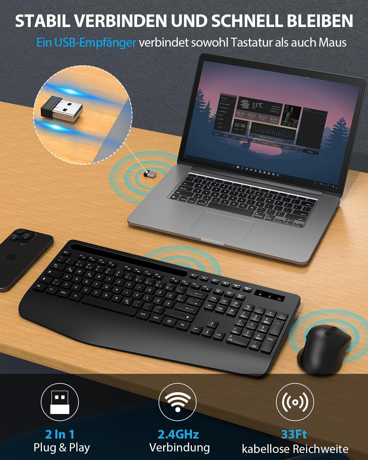 Комплект безжична клавиатура и мишка, поставка за китката, държач за телефон, включена батерия, 2.4G ергономична безжична клавиатура и мишка без латентност, тиха мишка и клавиатура за лаптоп, компютър, Mac, Windows