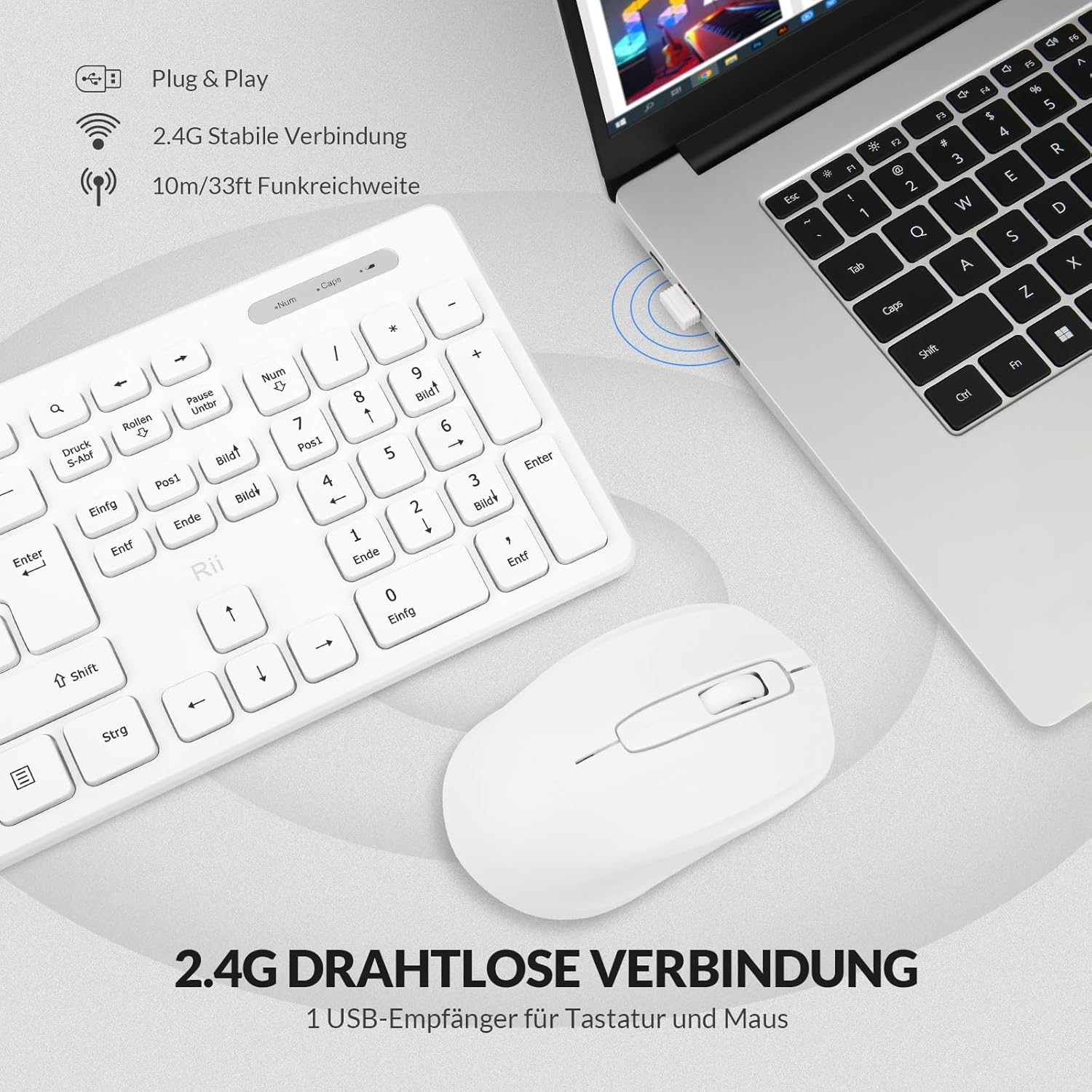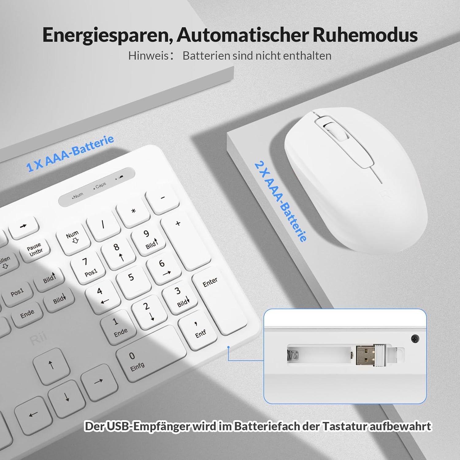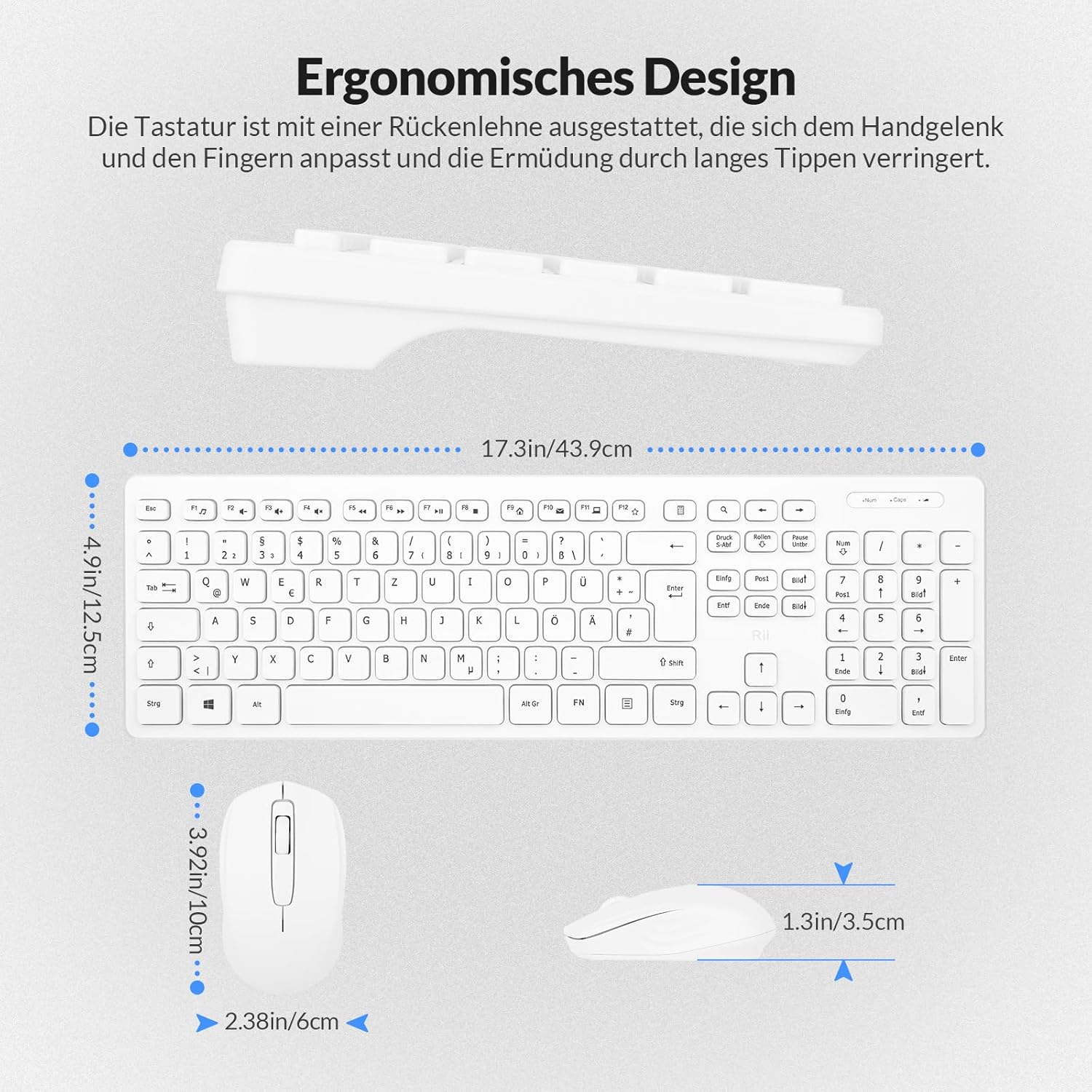 Комплект безжична клавиатура и мишка Rii, безжична клавиатура с мишка, безжична клавиатура и мишка, за компютър/лаптоп/Windows/Smart TV, немска подредба - бяла