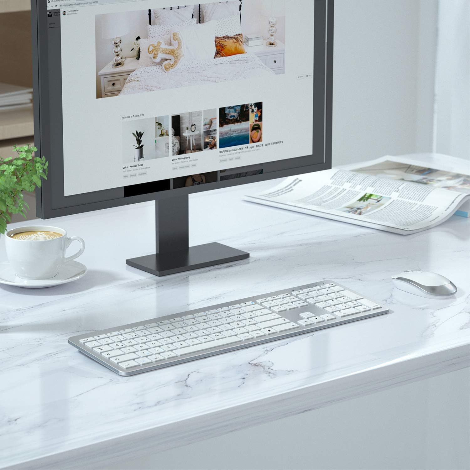 • 【Ултратънък и ергономичен дизайн】Ултратънка безжична клавиатура, ергономичен дизайн, тихо щракване, подходяща за всеки. Дизайнът на клавишите с ножично действие прави писането удобно. Ъгловият клавиш поддържа ръката ви за часове удобна работа.