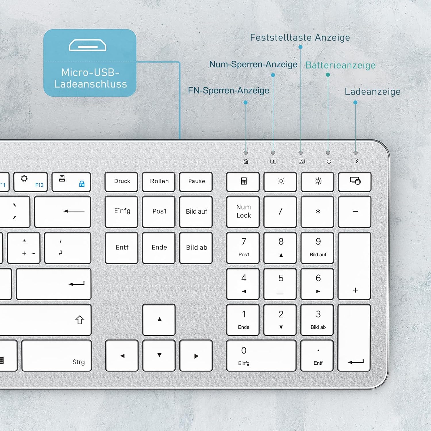Комплект безжична клавиатура и мишка, seenda SK38-3 ултратънка презареждаща се безжична клавиатура, ергономична клавиатура и мишка със силиконов капак за компютър/лаптоп/смарт телевизор, QWERTZ оформление, бяло и сребристо