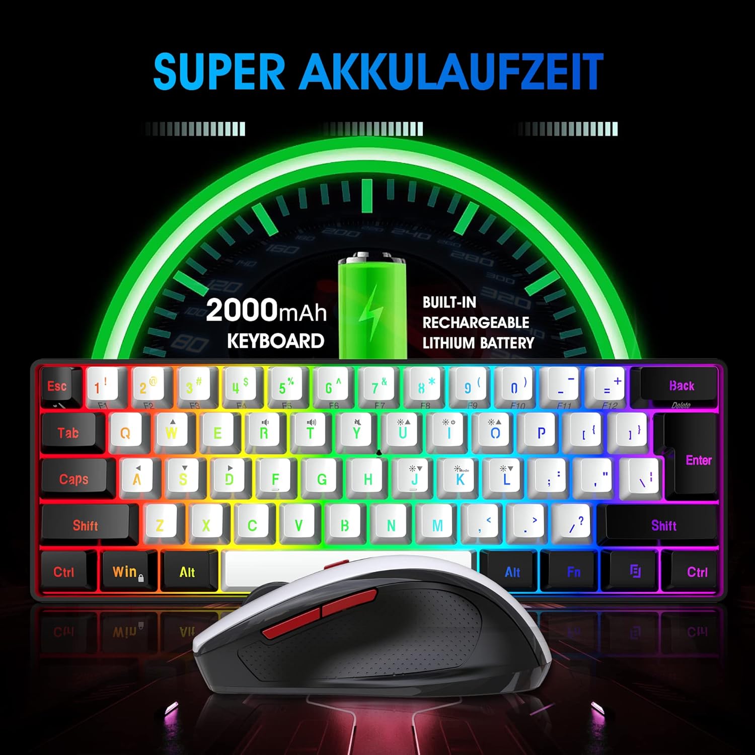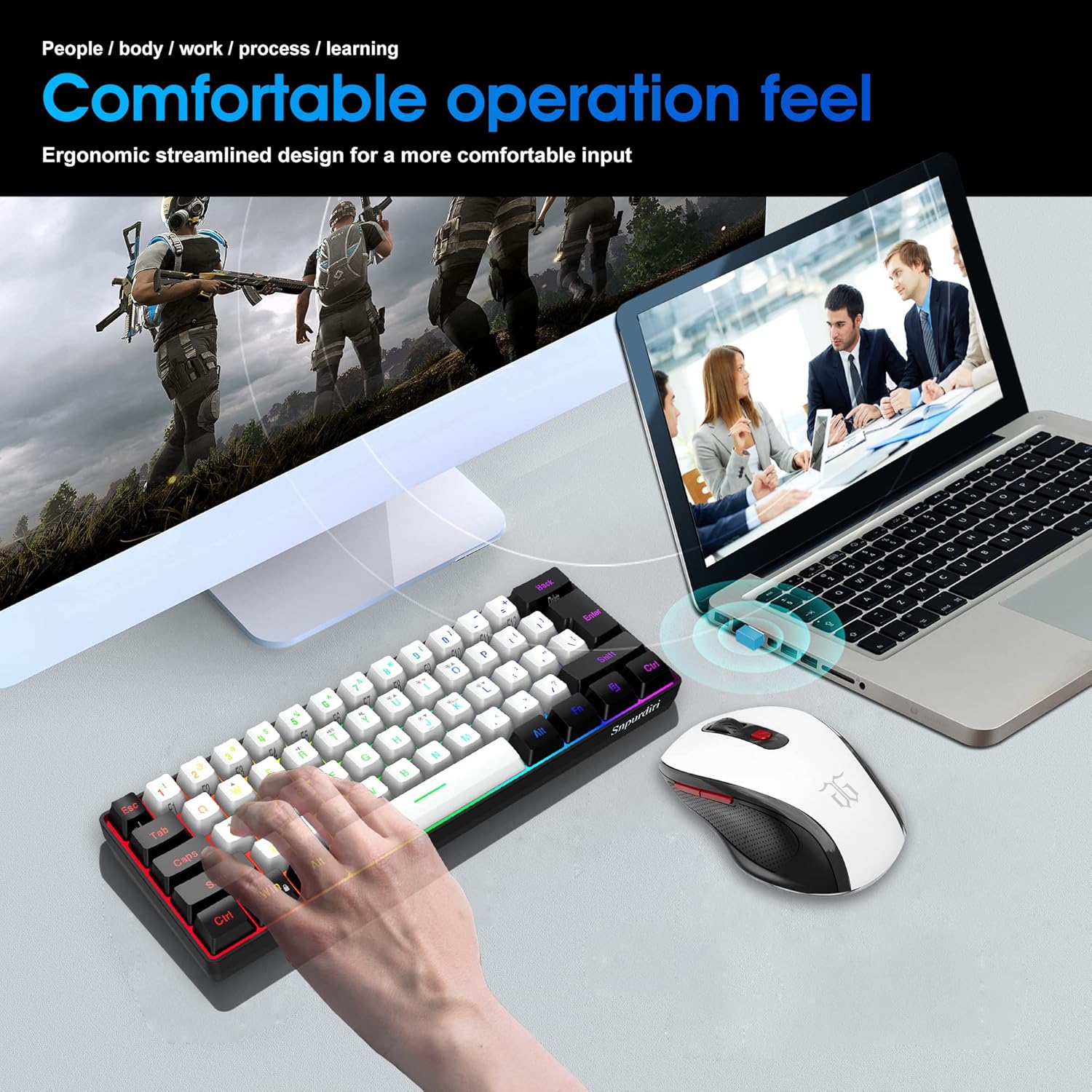 • 【Малка комбинация от геймърска клавиатура и мишка】Тази научно проектирана компактна 60% безжична клавиатура и сладка мишка с джобен размер са предназначени да създадат перфектната комбинация от игри и офис употреба. Тънкият и лек дизайн означава, че не заема много място и е удобна за пътуване.