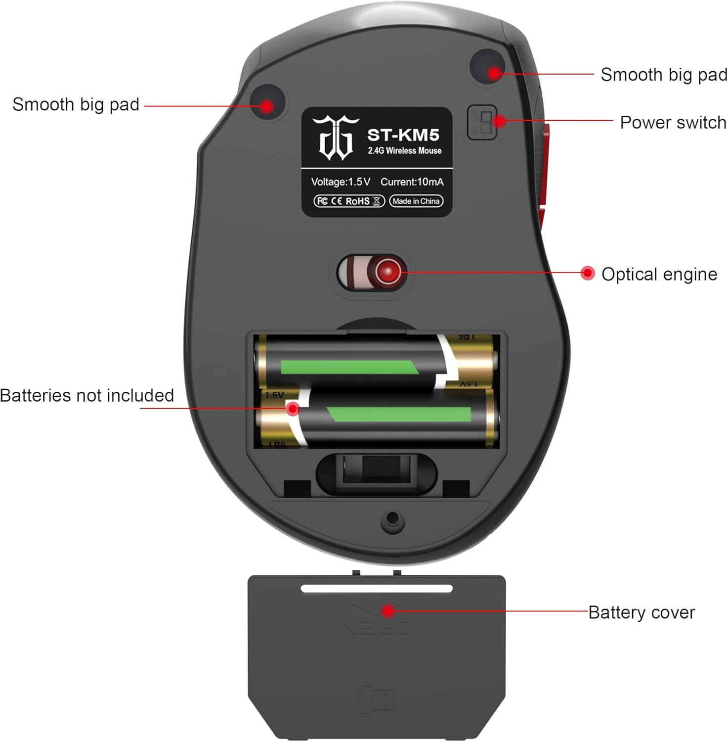 • Gebrauchsanweisung: Bevor Sie dieses Produkt verwenden, schalten Sie bitte den Schalter in der oberen rechten Ecke der Tastatur ein, und schalten Sie den Schalter an der Unterseite der Maus ein (kein Licht) oder auf LED (Licht).
