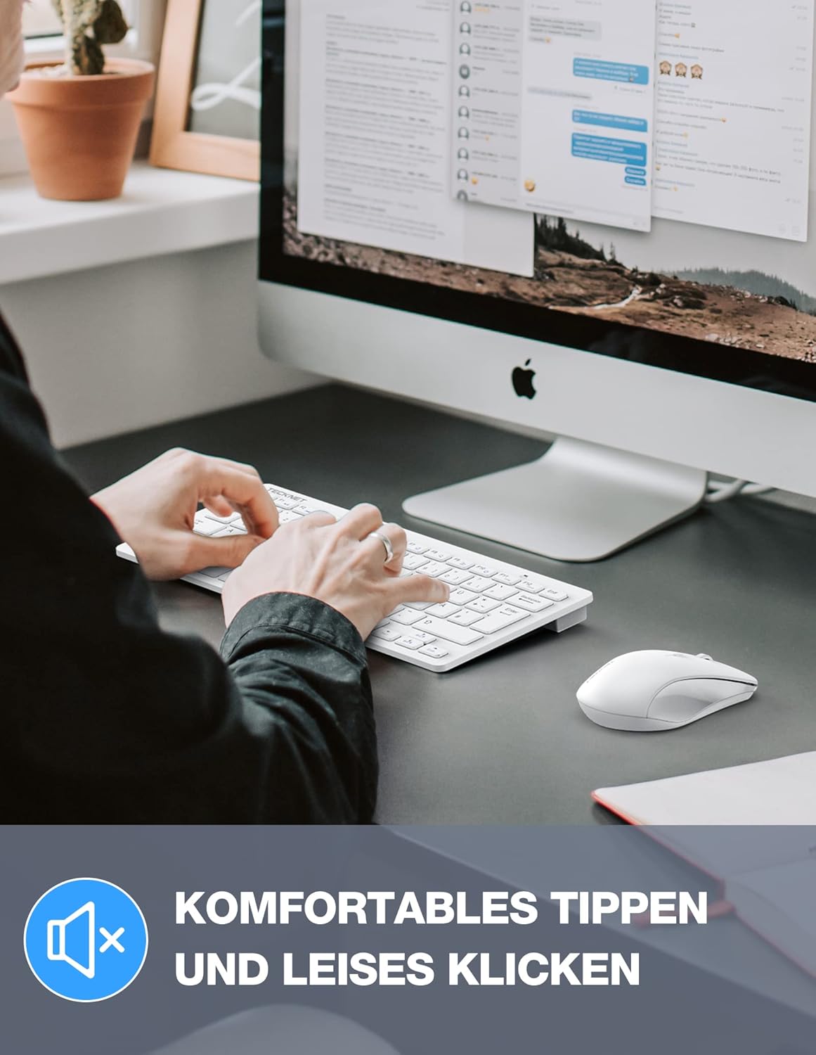 Комплект безжична клавиатура и мишка TECKNET, немска QWERTZ подредба, 2.4 GHz безжична мини клавиатура и мишка, обхват на свързване 15 м, безжична тиха безжична клавиатура с мишка за компютър, лаптоп, смарт телевизор, бяла