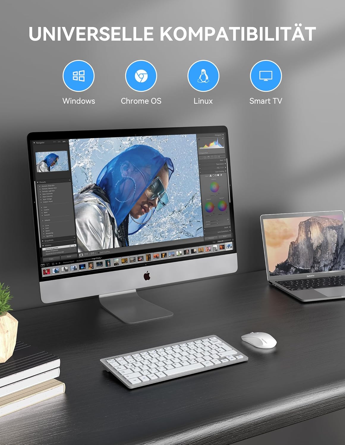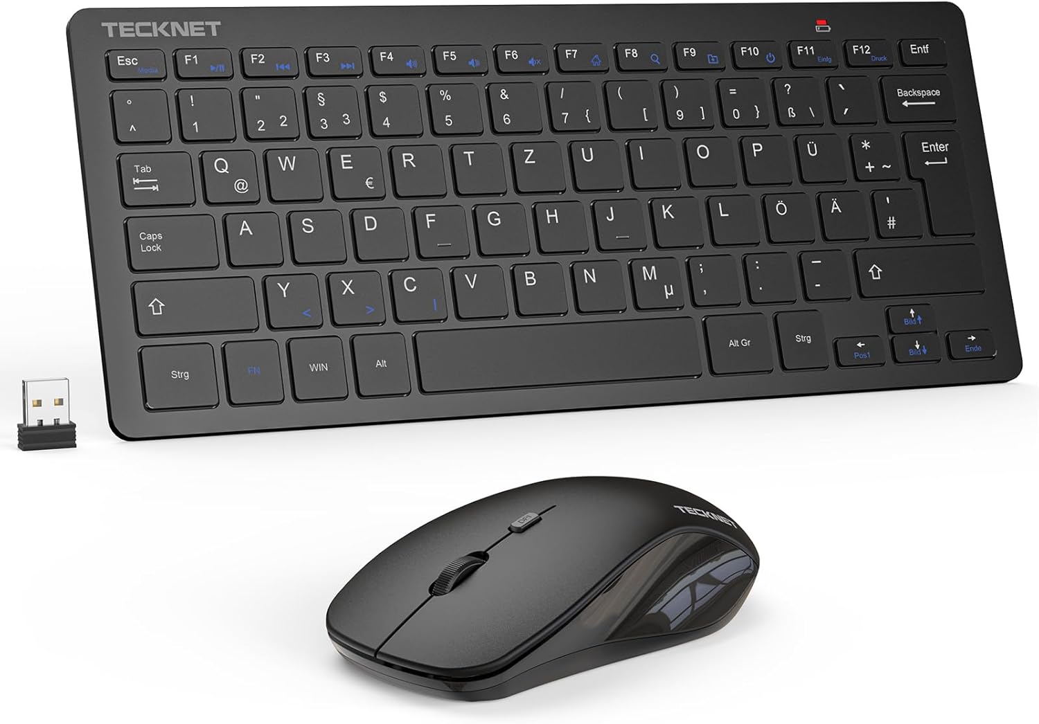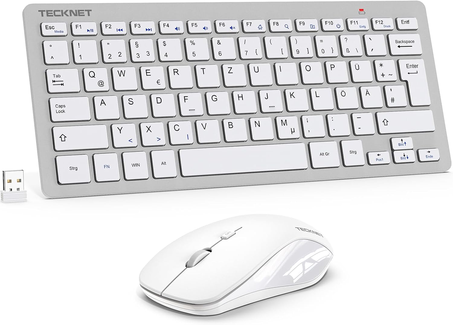 Комплект безжична клавиатура и мишка TECKNET, немска QWERTZ подредба, 2.4 GHz безжична мини клавиатура и мишка, обхват на свързване 15 м, безжична тиха безжична клавиатура с мишка за компютър, лаптоп, смарт телевизор, сребриста