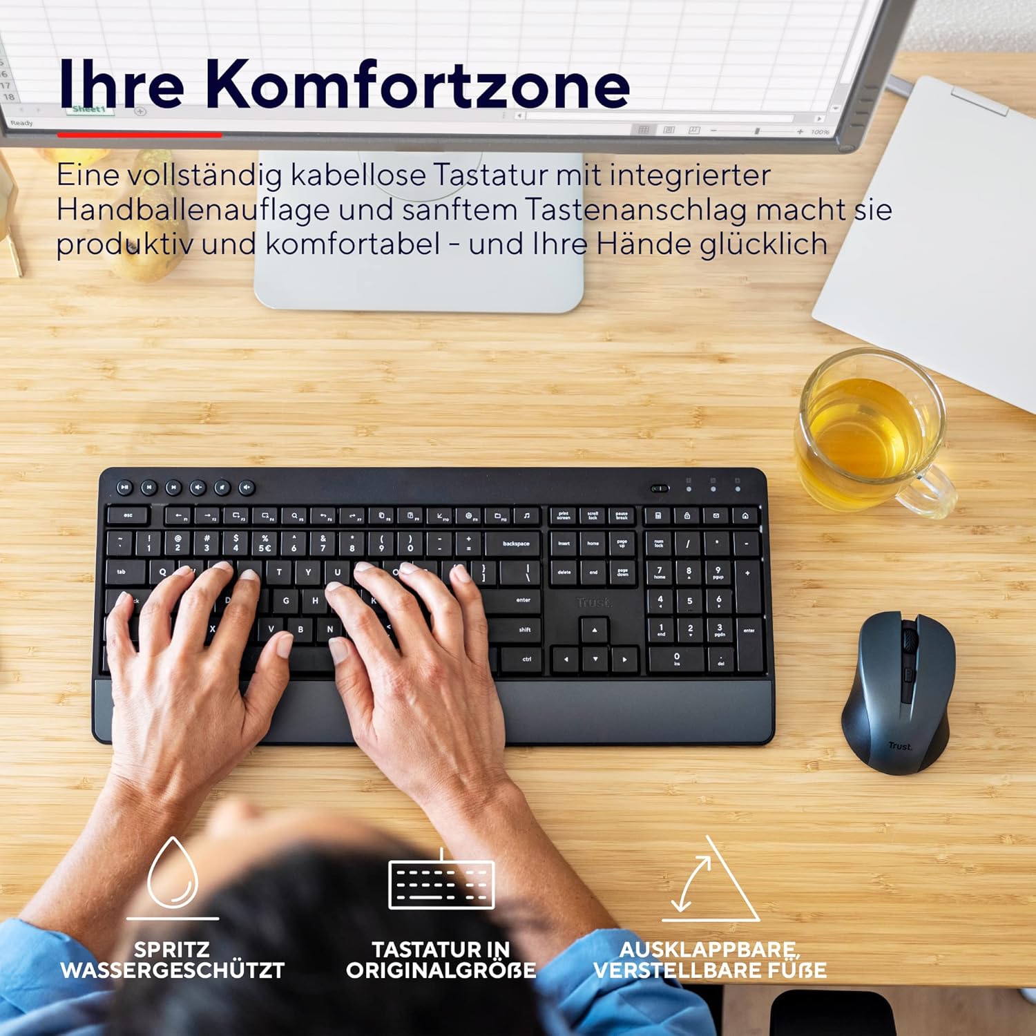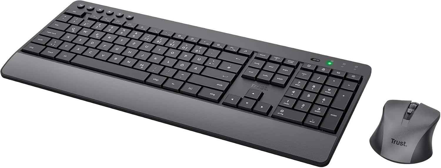 Комплект безжична клавиатура и мишка Trust Trezo, немска QWERTZ подредба, устойчив дизайн, безжична с безжична мишка, тиха и ергономична комбинация, 48 месеца живот на батерията, 2.4 GHz, компютър, лаптоп, черен