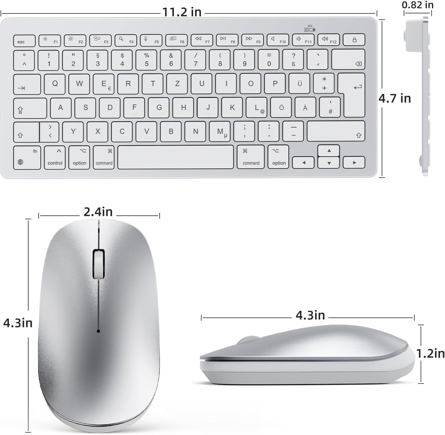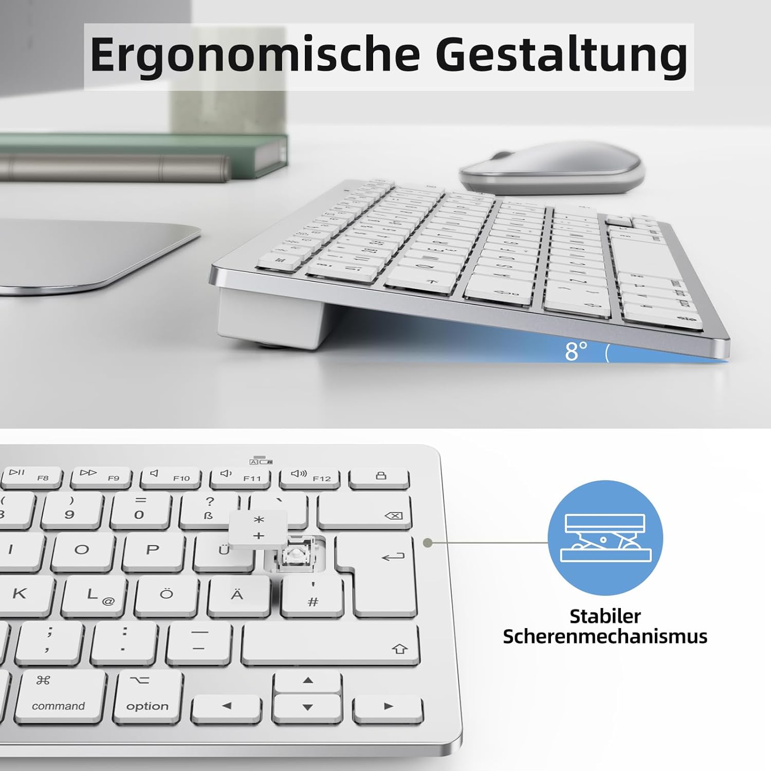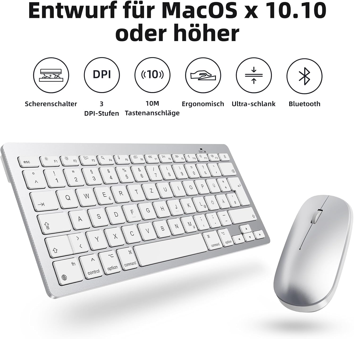 Комплект Bluetooth клавиатура и мишка OMOTON за Mac, компактна безжична клавиатура и мишка, съвместима с MacBook Pro/Air, iMac, iMac Pro, Mac mini, Mac Pro, QWERTZ DE оформление, сребриста