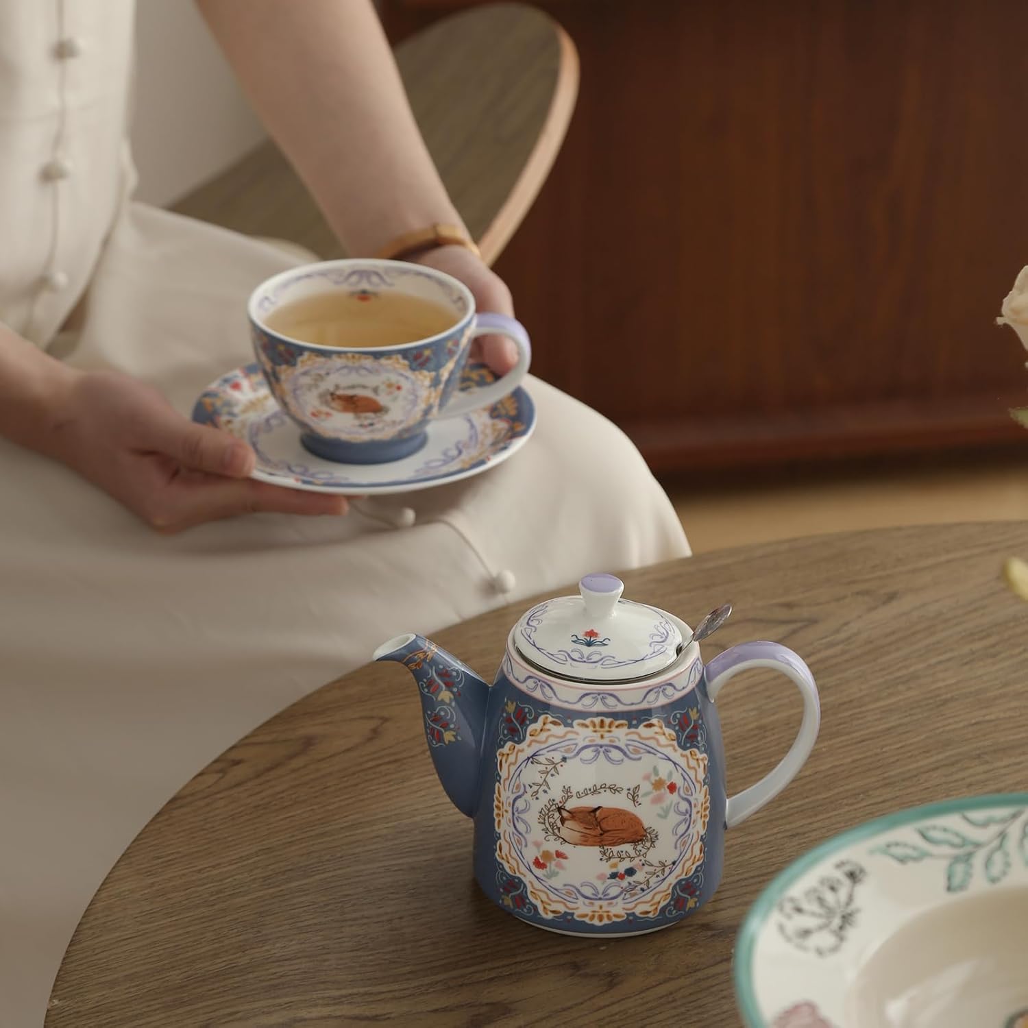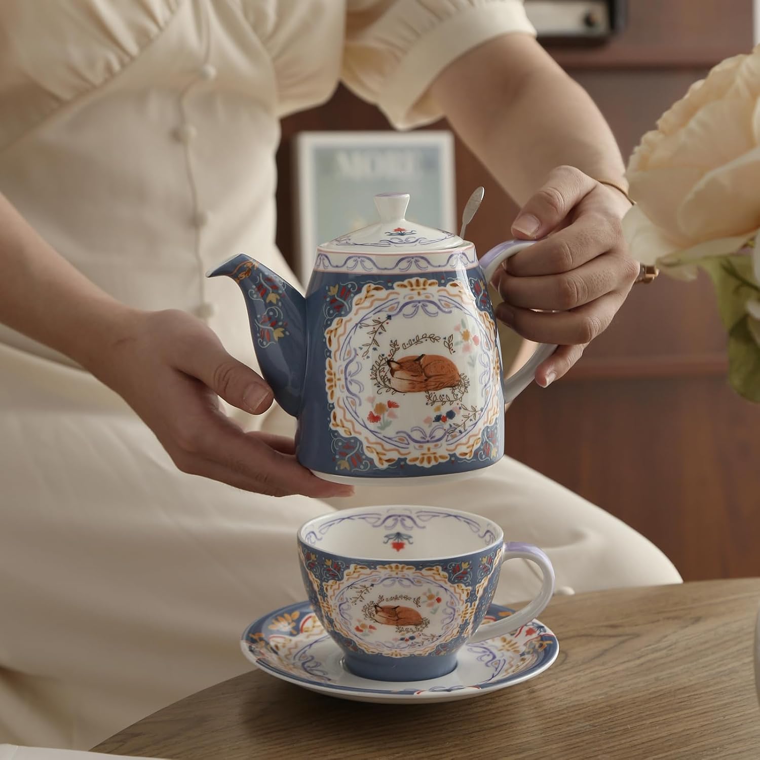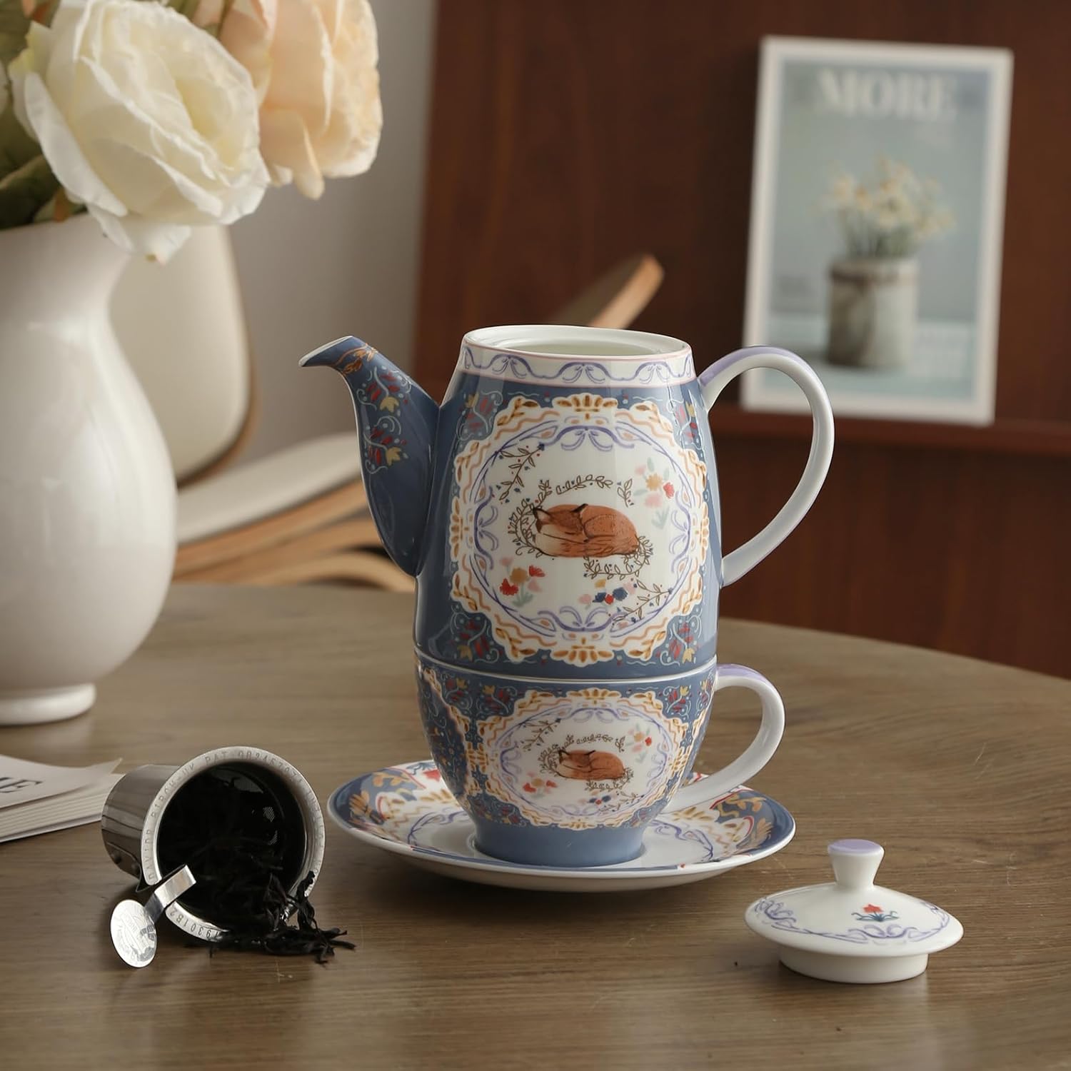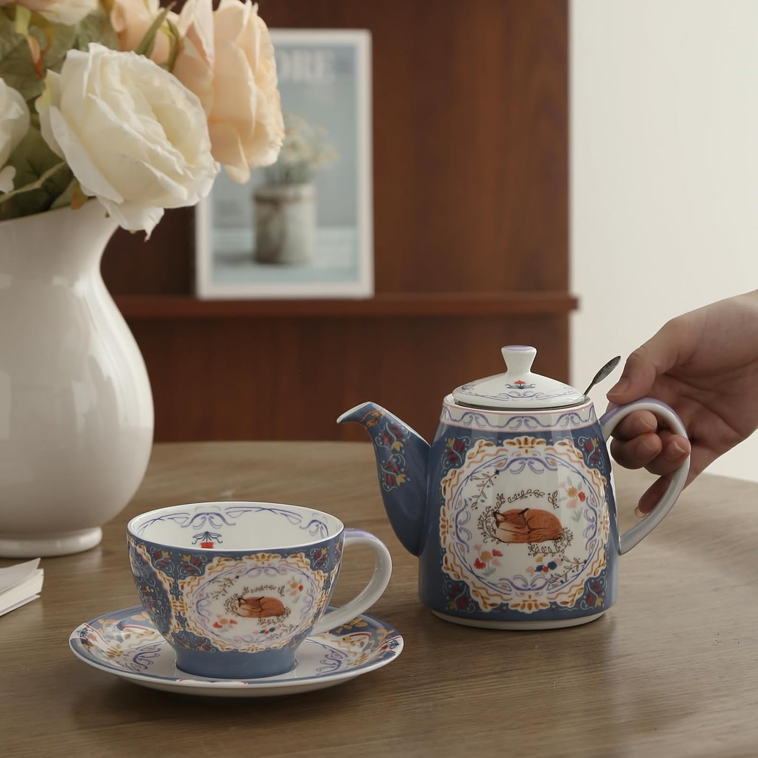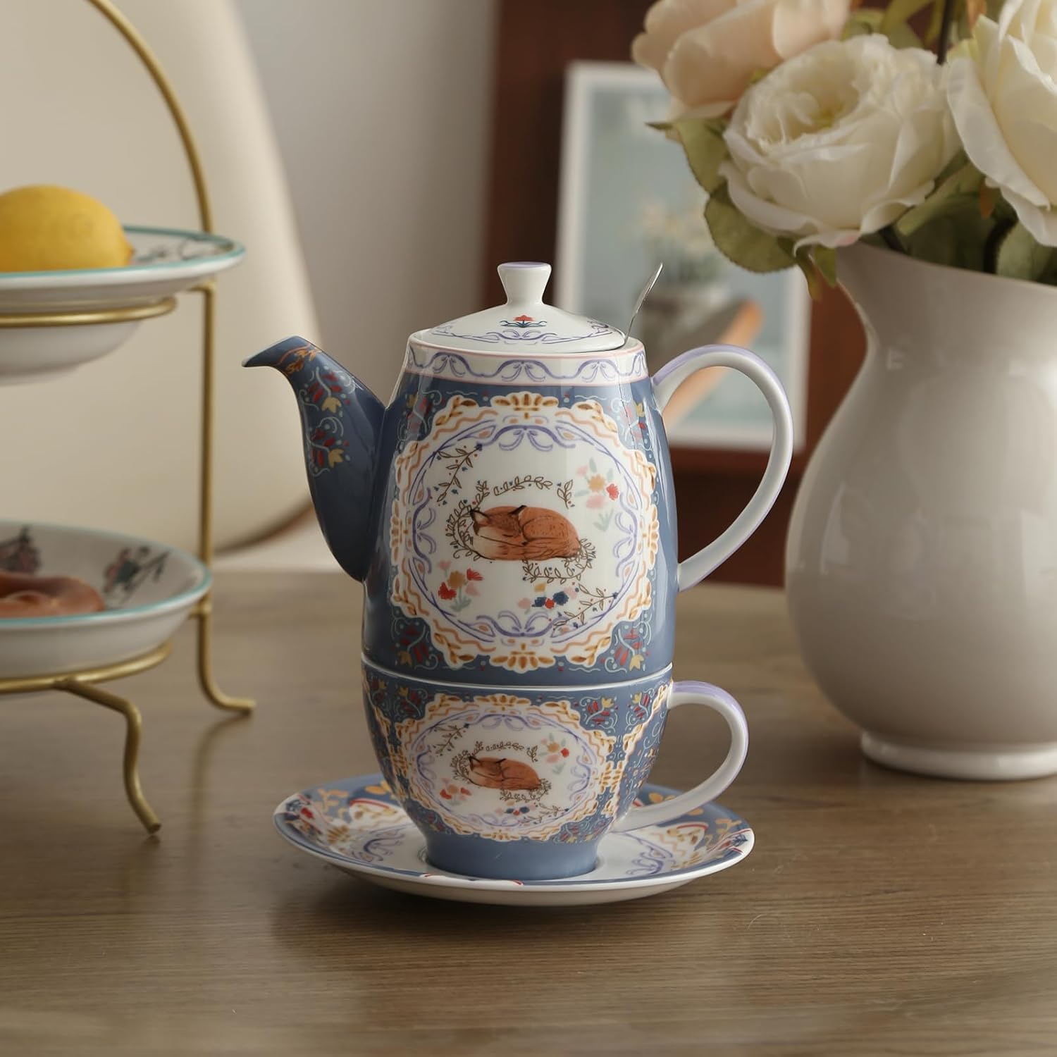 Комплект чайници от костен порцелан London Pottery, чайник и комплект за сервиране за един човек, животински мотив, чайник, чаша и чинийка (лисица)